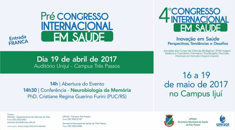 Na tarde desta quarta-feira, às 14h, o Campus Três Passos da Unijuí recebe o Pré-Congresso Internacional em Saúde, com palestra sobre Neurobiologia da Memória. O tema será tratado pela PhD Cristiane Regina Guerino Furini (PUC/RS).