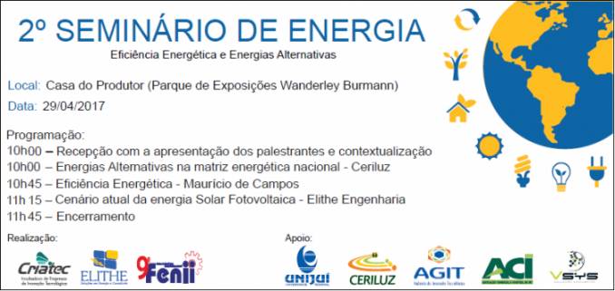 Debater, difundir tecnologias e relatar experiências que possam auxiliar no uso de energia disponível de forma racional é um dos objetivos do 2º Seminário de Energia, que será realizado na Feira pela Elithe Soluções em Engenharia e Consultoria, empresa incubada da Criatec.