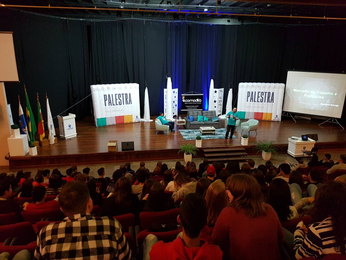 O projeto "Palestra nas Escolas" reuniu nesta sexta-feira, 12, no Salão de Atos Argemiro Jacob Brum, alunos das escolas de Ensino Médio de Ijuí: Centro de Educação Básica Francisco de Assis (EFA), São Geraldo, Emil Glitz, Ruyzão, Otávio Caruso Brochado da Rocha, Escola Técnica 25 de Julho, e a Escola de Ajuricaba, Comendador Soares de Barros, para um bate-papo sobre Enem e Mercado de Trabalho. O diálogo com os estudantes foi conduzido pelo administrador e consultor de carreiras, Giancarlo Bottega, e pelo administrador Éder Schuinsekel, da equipe de Relacionamento da Unijuí.