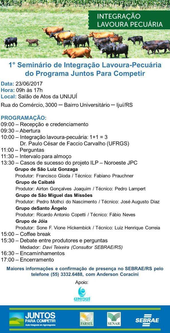 Na próxima sexta-feira, 23, a Unijuí sedia o primeiro Seminário de Integração Lavoura-Pecuária do programa Juntos Para Competir. O evento acontece no Salão de Atos da Biblioteca Mario Osorio Marques, a partir das 9h. Na programação, palestras e relatos de produtores locais compõem as atividades que seguem até as 17h. Segundo a gestora de projetos em Agronegócios da Regional Noroeste do Sebrae, Eloisa Muxfeldt, trata-se do primeiro evento estadual promovido através desta parceria entre Sebrae, Senar e Farsul, coordenadores do programa Juntos para Competir.