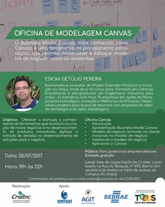 O Business Model Canvas, mais conhecido como Canvas, é uma ferramenta de planejamento estratégico, que permite desenvolver e esboçar modelos de negócios novos ou já existentes. Para isso, a oficina estará dividida em introdução e apresentação ao Business Model Canvas, direcionamento ao cliente, inovando e validando o modelo de negócio e aplicação do Canvas. O palestrante será o economista e consultor do Projeto Extensão Produtiva e Inovação na Unijuí, Esiom Getúlio Pereira, com experiência em mais de 70 empresas em ações de Planejamento Estratégico, Inovação e Melhorias de Processo.