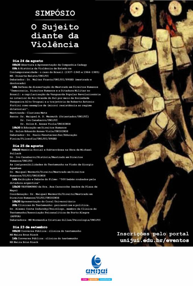Nos dias 24 e 25 de agosto, o Auditório da Sede Acadêmica da Unijuí vai receber o Simpósio "O Sujeito Diante da Violência". As palestras e atividades vão discutir temas sobre a violência e os Direitos Humanos.