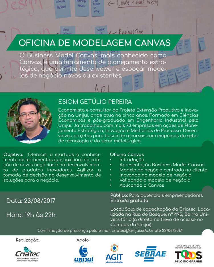 Com objetivo de proporcionar o contato com ferramentas para auxiliar na criação de novos negócios e no desenvolvimento de produtos inovadores, além de agilizar na tomada de decisão na solução de problemas de negócios, a Incubadora de Empresas de Inovação Tecnológicas da Unijuí – Criatec, está oferecendo uma Oficina de Modelagem Canvas. Será no dia 23 de agosto, quarta-feira, na sala de capacitação da Criatec, das 19h às 22h.