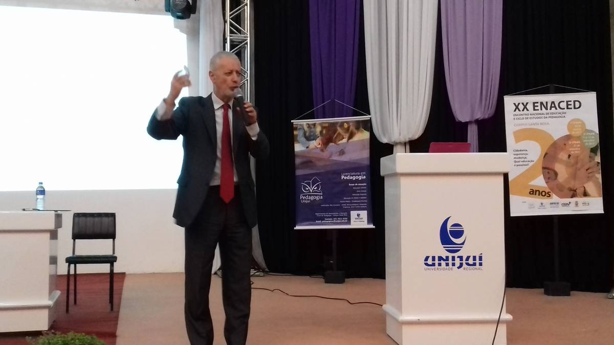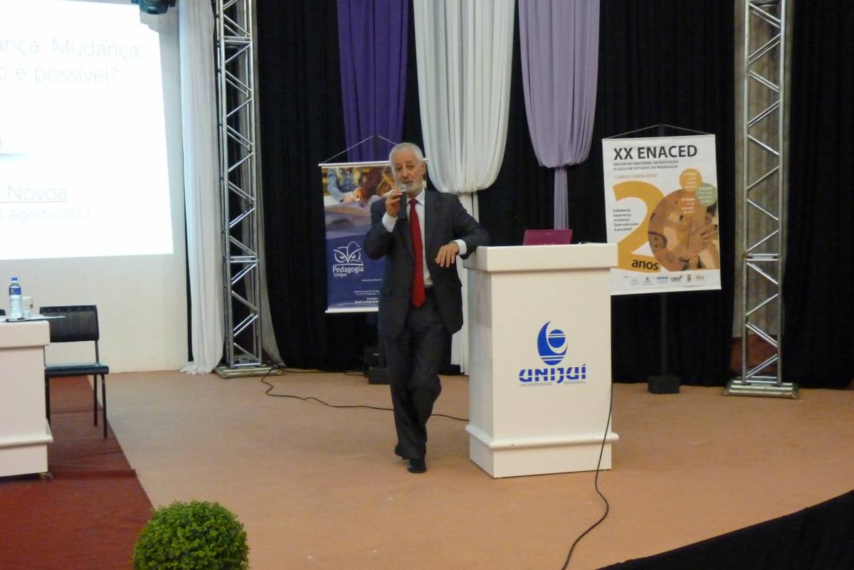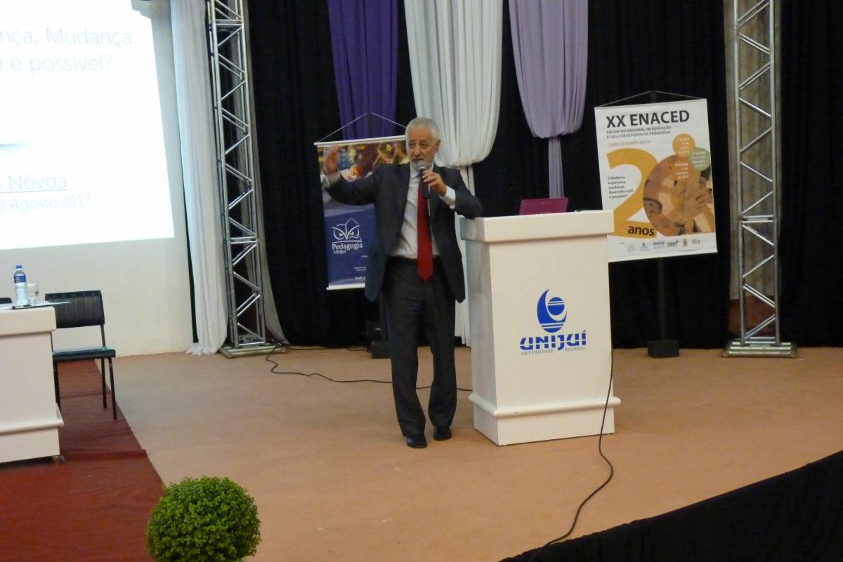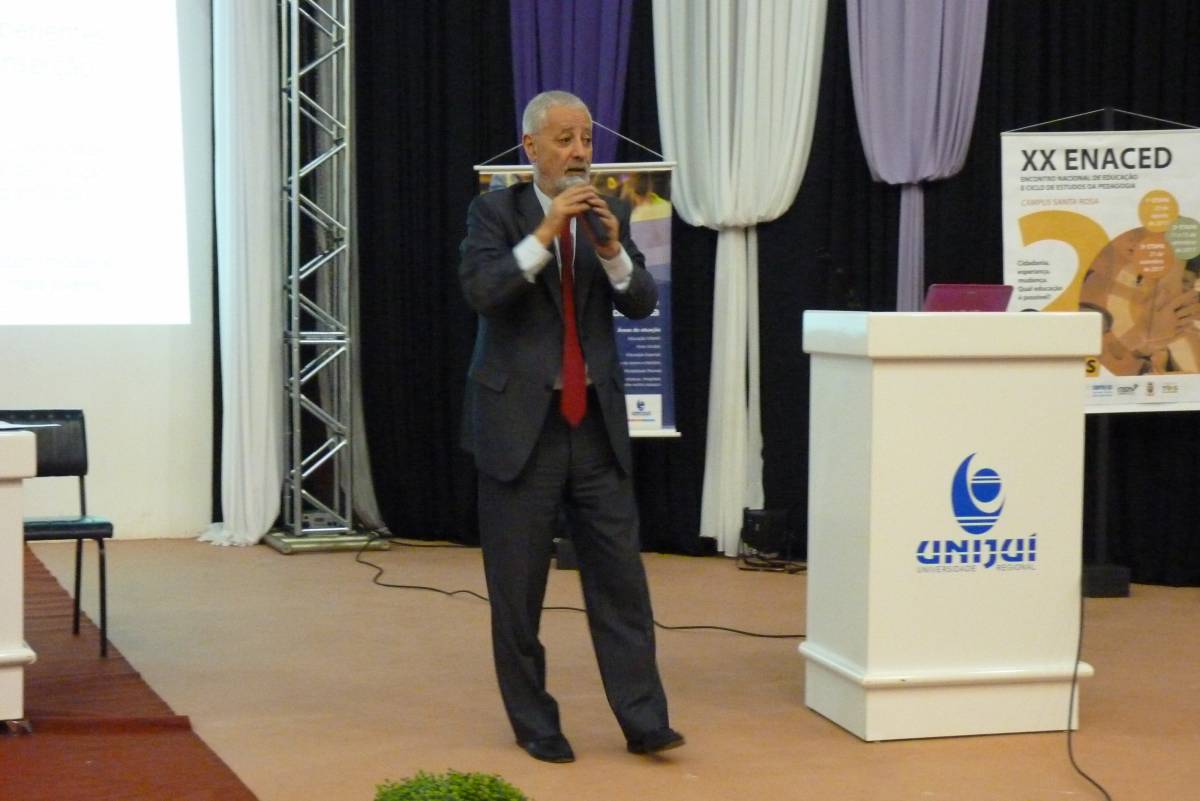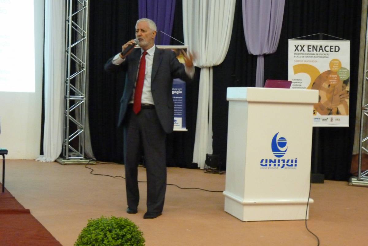 O Encontro Nacional de Educação e Ciclo de Estudos da Pedagogia (Enaced) realizou a abertura oficial da primeira etapa do evento, na noite de quarta-feira, dia 23, no Auditório Central da UNIJUÍ Campus Santa Rosa. Com o auditório lotado, o evento contou com a participação especial do professor catedrático do Instituto de Educação da Universidade de Lisboa (Portugal), Antônio Manuel Seixas Sampaio da Nóvoa.