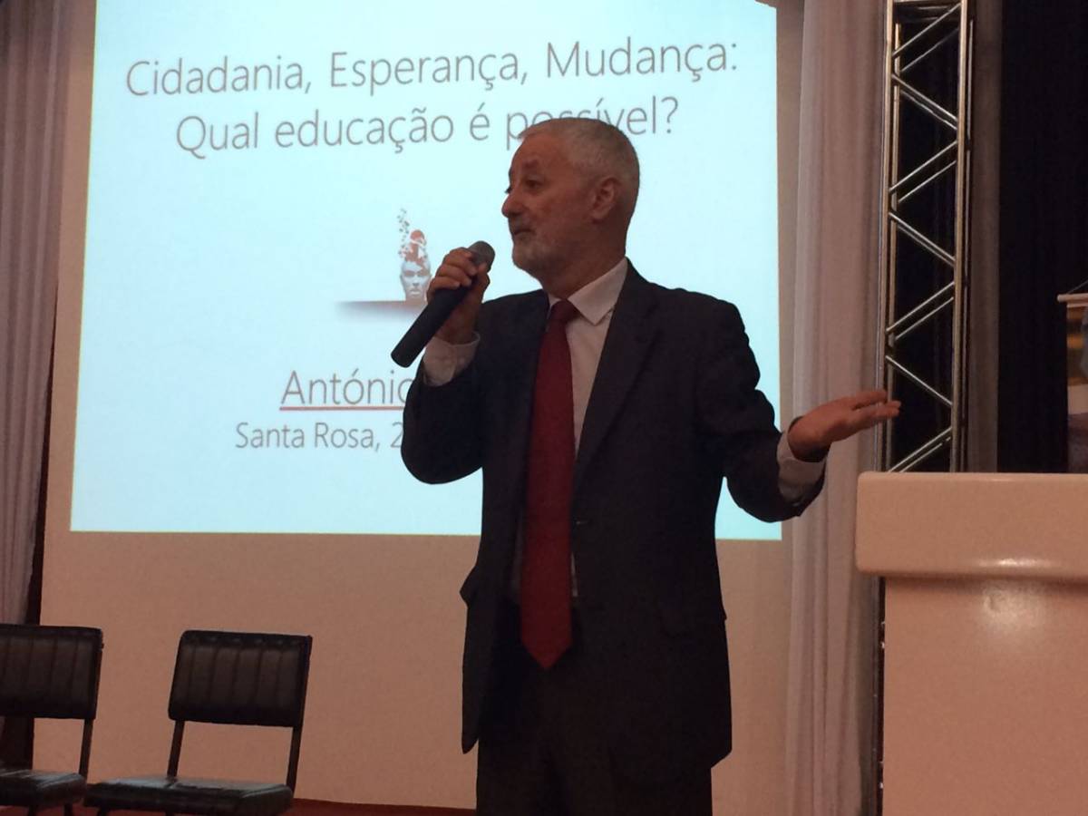 Professor Antônio durante a palestra trouxe a temática “Formação de professores e de esperança”, onde originou várias reflexões sobre a revolução que a aprendizagem está perpassando nos dias atuais. “Os alunos aprendem muito mais uns com os outros, do que somente com os professores, através de aulas expositivas”, destacou Nóvoa.