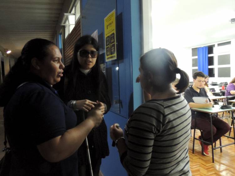 Acompanhamos um pouco da rotina da estudante. Pedimos licença para frequentar uma aula com ela e com a agente educacional que lhe acompanha na trajetória acadêmica, Joceane Severo. Preocupada, Fernanda, ainda na tarde, pediu para avisar que poderia chegar um pouco atrasada, que iria direto para a sala de aula, pois havia firmado compromisso com a Medianeira Transportes. Estava mostrando aos cobradores e motoristas, na prática, como usa o transporte coletivo pela cidade e o que pode melhorar para a acessibilidade. Chegou por volta das 19h15, com a aula já iniciando. Da porta da sala, foi possível ver os funcionários da empresa indo embora em um dos coletivos que levam e trazem Fernanda e os demais estudantes com vendas, dialogando.