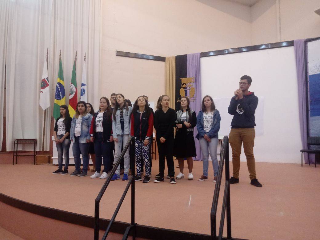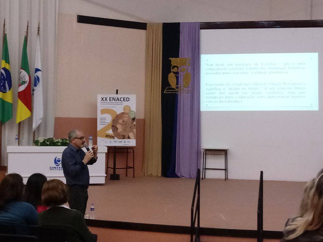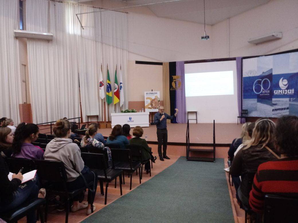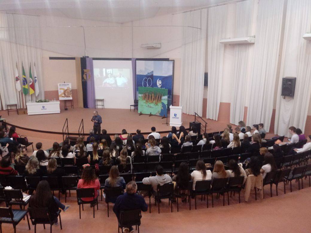 As normalistas prestigiaram a palestra com o professor Arnaldo Nogaro, da URI – Erechim. O palestrante em sua fala destacou como tema, “A esperança e a docência”. Nos turnos da tarde e noite acontecerem comunicações de pesquisas e relatos de experiências.