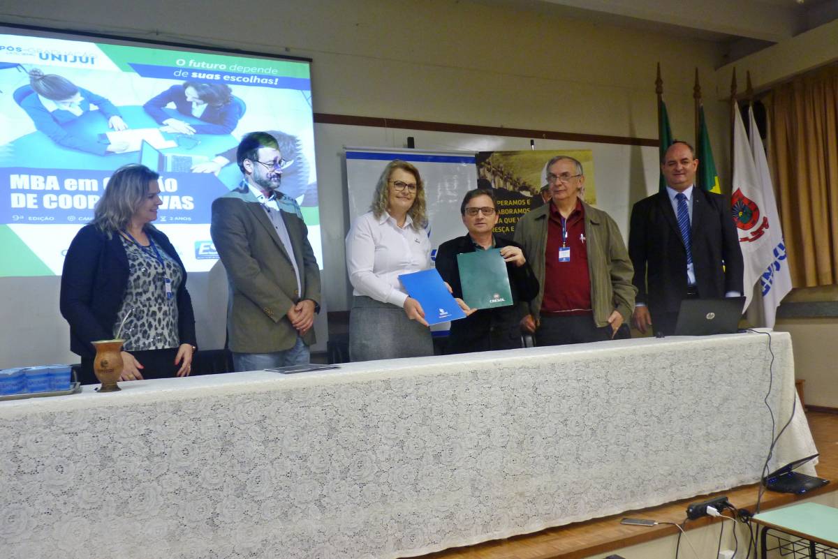 Na oportunidade estiveram presentes a Coordenação do Curso, autoridades da UNIJUÍ e CRESOL e estudantes matriculados. No primeiro momento do encontro ocorreu a oficialização do termo de Cooperação entre UNIJUÍ e CRESOL.