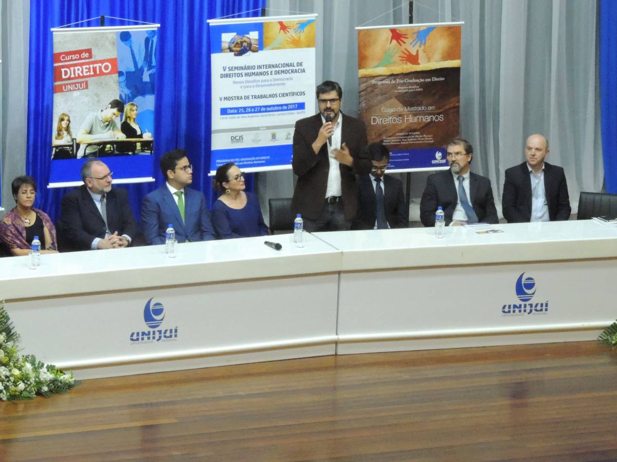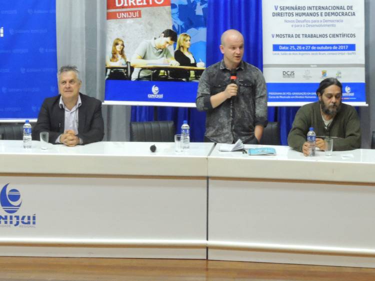 Com uma discussão sobre “Democracia, Desenvolvimento e Direitos Humanos”, teve início, na noite desta quarta-feira, o V Seminário Internacional de Direitos Humanos e Democracia e V Mostra de Trabalhos Científicos na Unijuí, no Salão de Atos Argemiro Jacob Brum. Participaram da primeira noite de evento, o professor Dr. Marcelo Richard Zelic (Vice-presidente do Grupo Tortura Nunca Mais/SP) e o professor Dr. Dejalma Cremonese (UFSM/Brasil), com a mediação do professor Dr. Maiquel Wermuth (Unijuí).