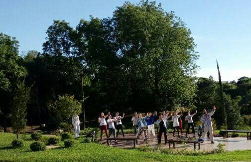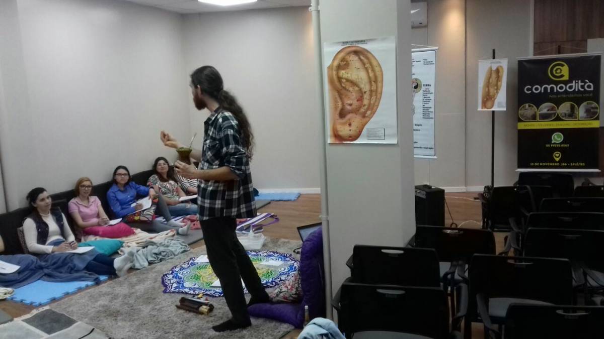 Durante as práticas do curso, os participantes puderam realizar uma meditação para o chacra cardíaco, realizada no domingo pela manhã, aproveitando o dia ensolarado e o espaço qualificado para este tipo de prática no Campus Ijuí. O terapeuta que conduziu a meditação (professor do curso) Dionei Ruã dos Santos propôs esta meditação ativa aos participantes do curso justificando os benefícios das práticas meditativas.