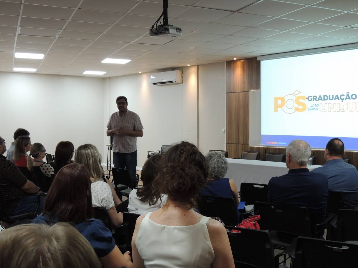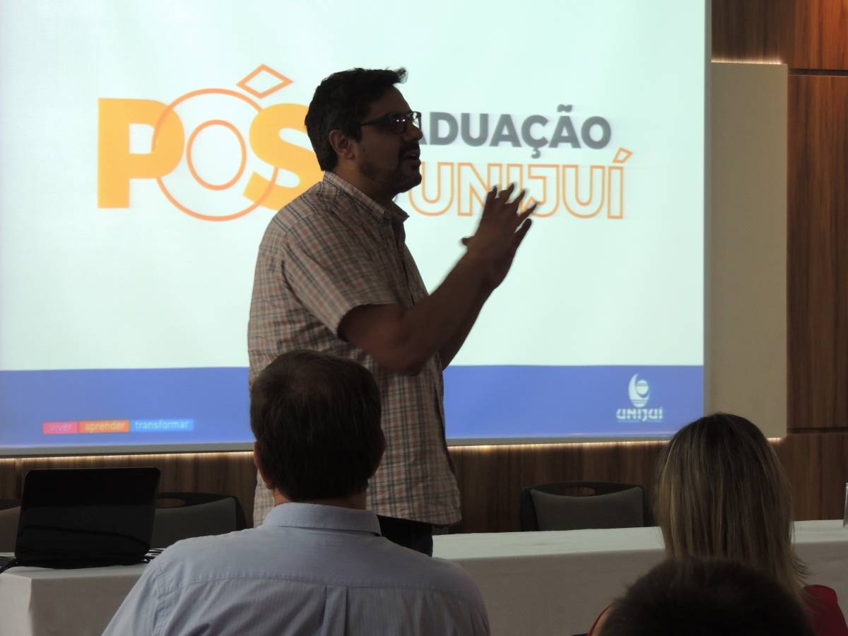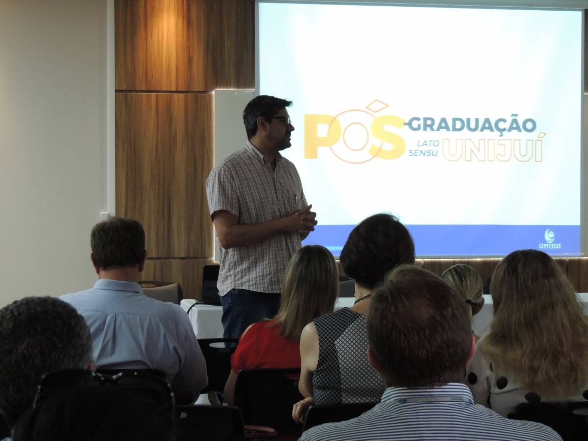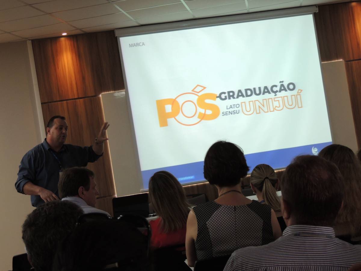 Com o mote “Viva essa experiência transformadora”, a campanha dos cursos de Pós-Graduação da Unijuí foi lançada na tarde desta terça-feira, dia 19, no Centro de Eventos do Campus Ijuí. O gerente da Coordenadoria de Marketing da Unijuí, Giancarlo Bottega, realizou a apresentação do conceito e dos materiais de comunicação da Campanha para a Reitoria, chefes de departamentos, coordenadores de cursos e profissionais que vão trabalhar na divulgação e efetividade das ofertas.