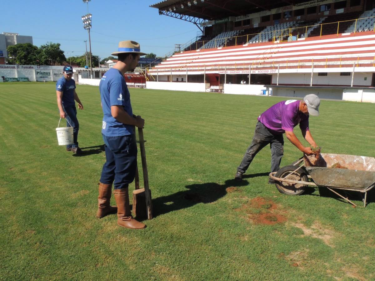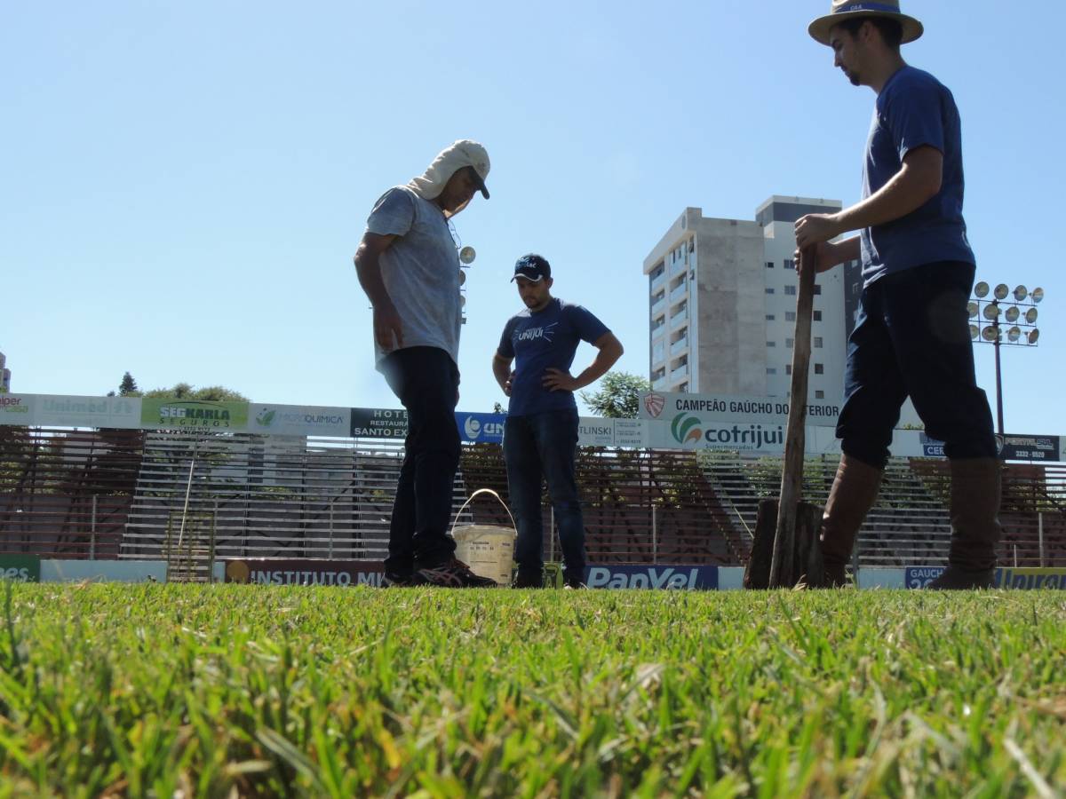 O professor do Departamento de Estudos Agrários Emerson André Pereira, juntamente com estudantes de Agronomia e de Medicina Veterinária, e do engenheiro agrônomo Ilson Fernando Rychesky, egresso da primeira turma do curso na Universidade, além de funcionários do clube, têm realizado um intenso trabalho no gramado. O resultado pode ser conferido nas rodadas do Gauchão que está em andamento.