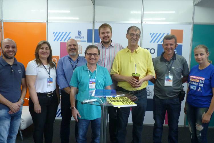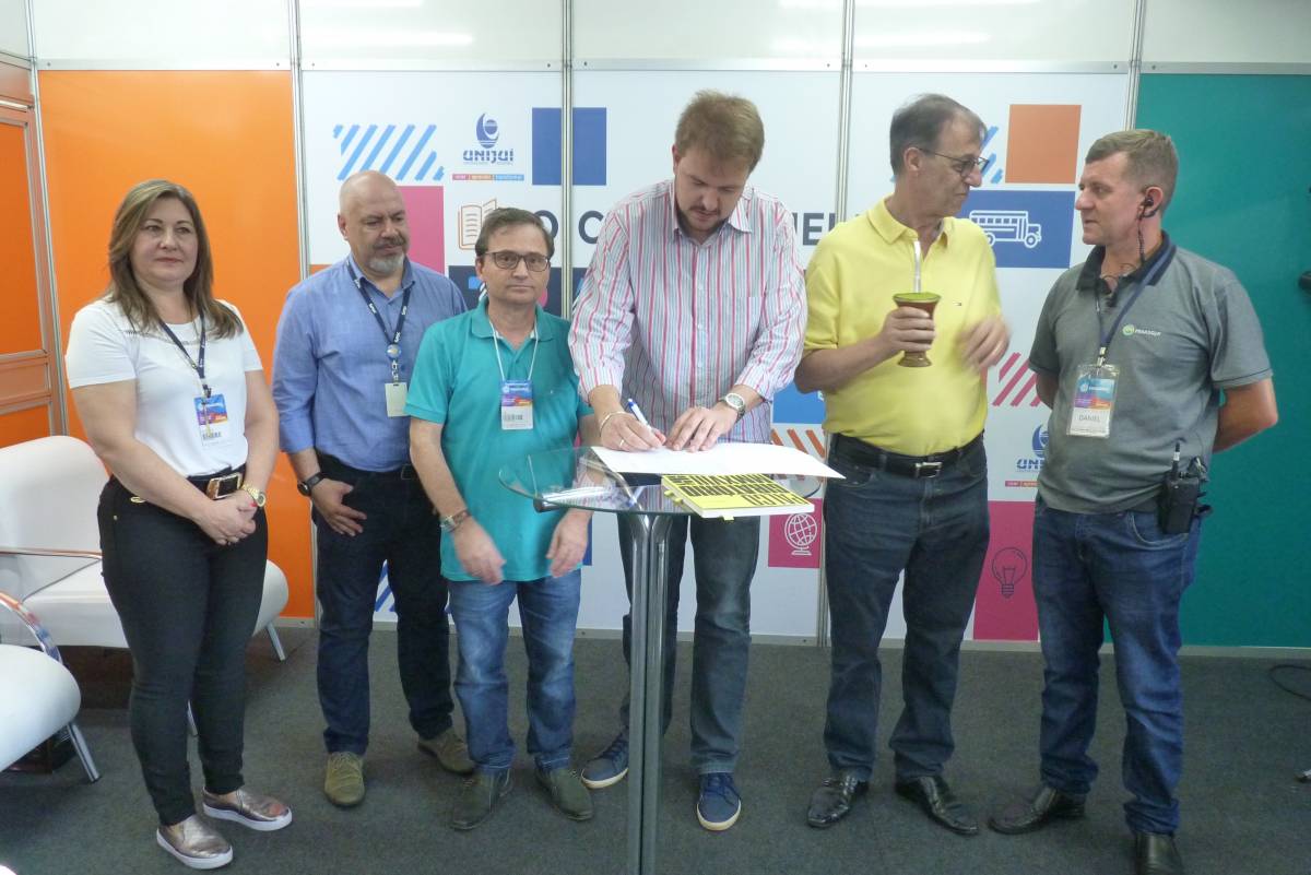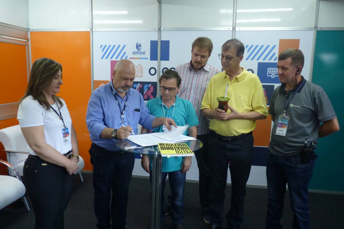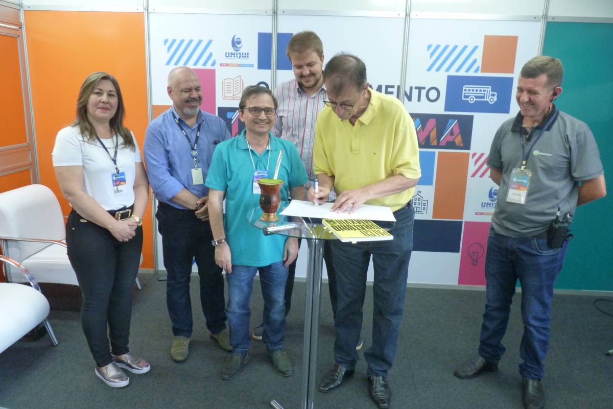 A UNIJUÍ realizou a assinatura de convênio com o SESC, na manhã desta sexta-feira, dia 04, no estande da Universidade, durante a Fenasoja. O termo visa a cooperação para a realização da 4ª Aldeia SESC Yvy Pytã, em Santa Rosa.