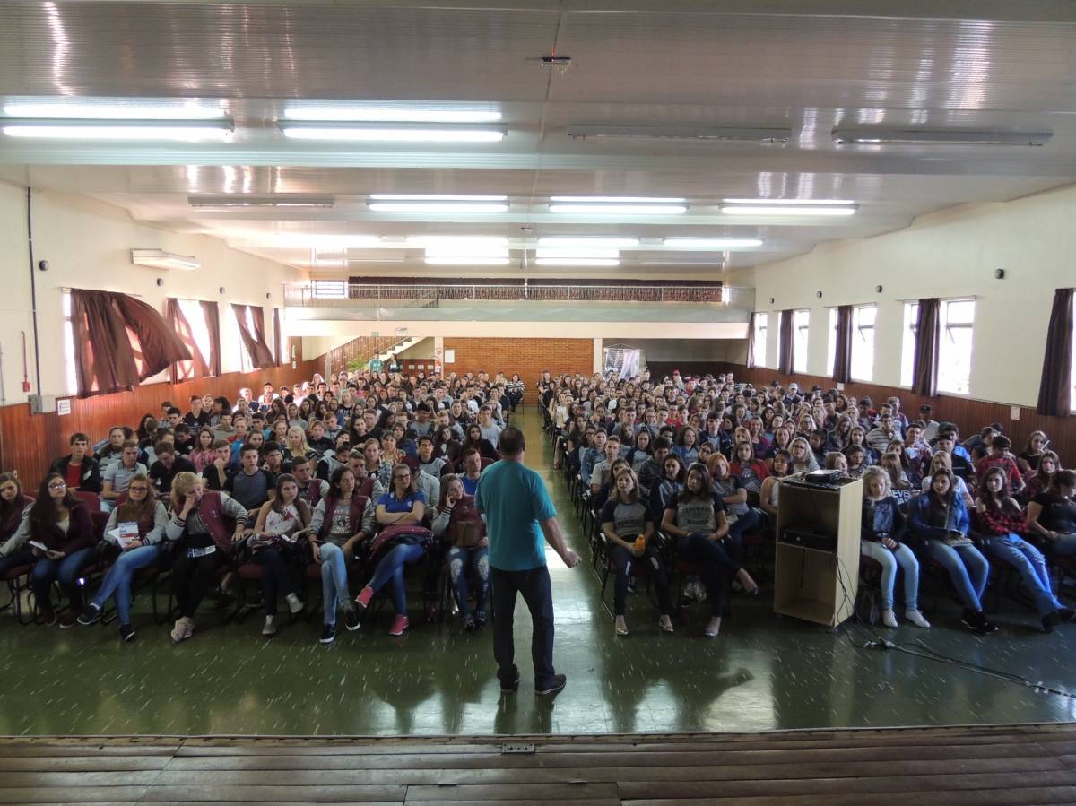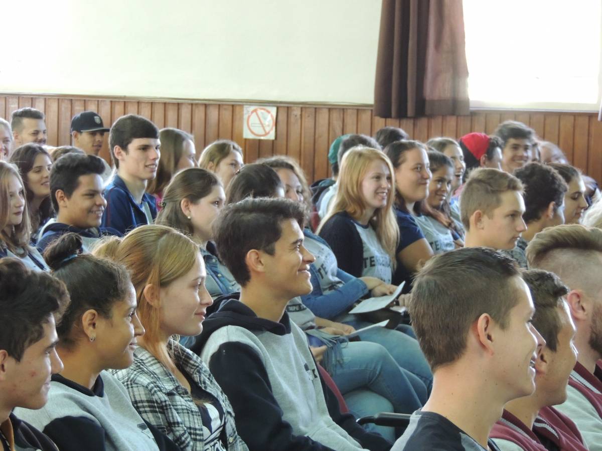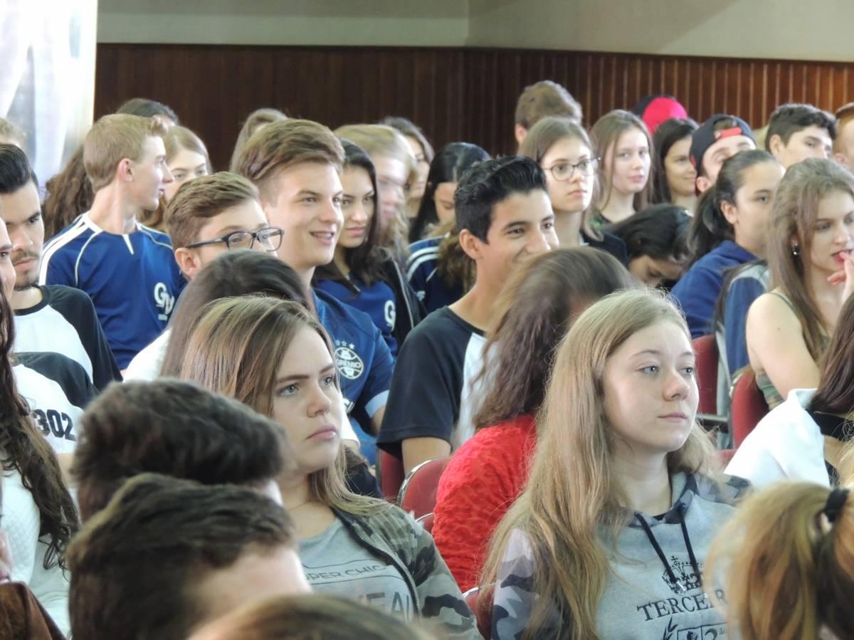 A Diana Carine Apio, da Escola Getúlio Vargas, de Derrubadas, participou nessa quinta-feira do primeiro Bate-Papo Unijuí com outros 450 alunos da região de Três Passos. A palestra “Mercado de Trabalho e Escolha Profissional”, ministrada pelo gerente de Marketing da Unijuí, Giancarlo Bottega, foi realizada no campus Três Passos.
