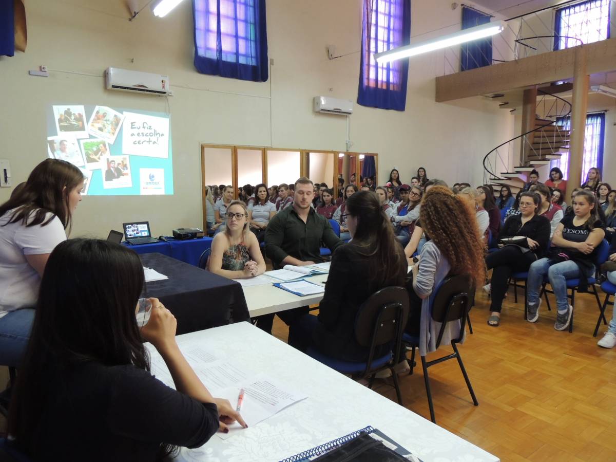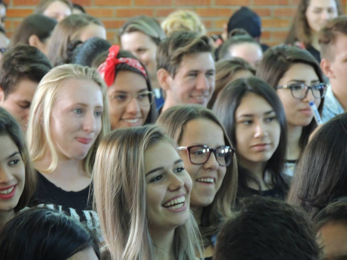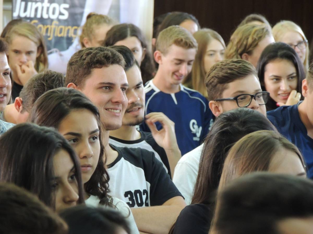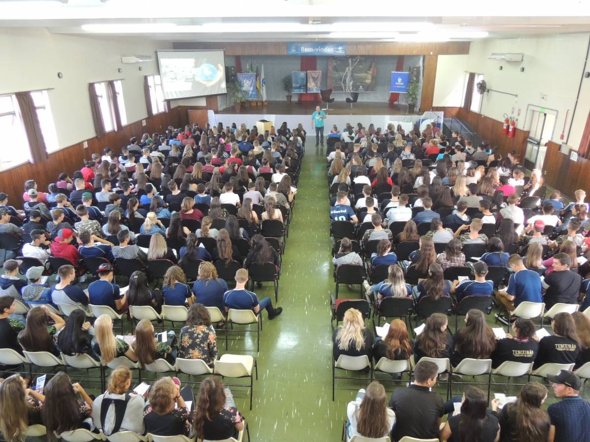 A Diana Carine Apio, da Escola Getúlio Vargas, de Derrubadas, participou nessa quinta-feira do primeiro Bate-Papo Unijuí com outros 450 alunos da região de Três Passos. A palestra “Mercado de Trabalho e Escolha Profissional”, ministrada pelo gerente de Marketing da Unijuí, Giancarlo Bottega, foi realizada no campus Três Passos.