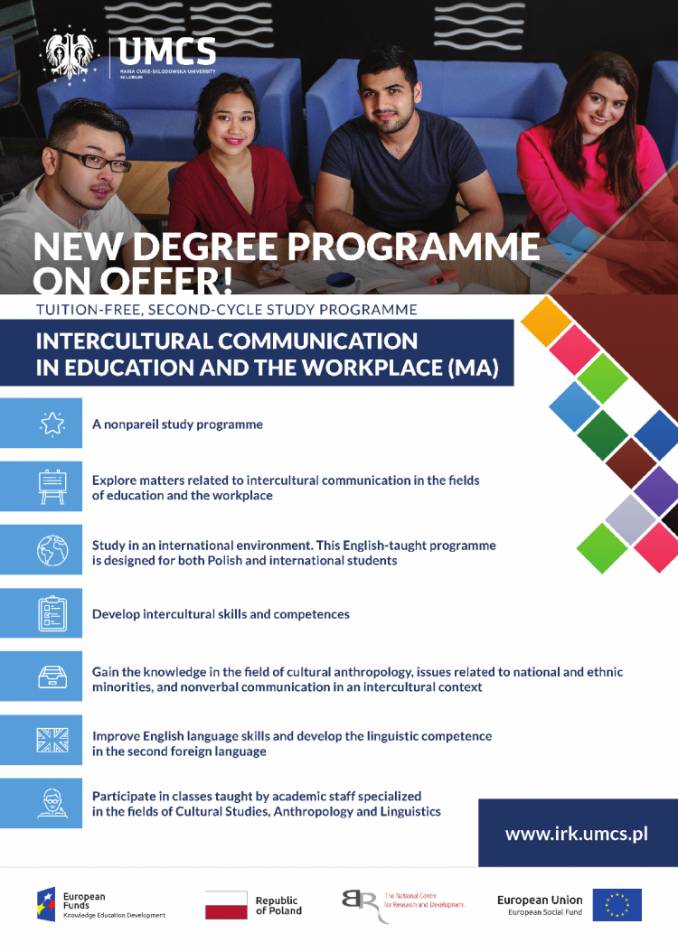 Os estudos “Intercultural Communication in Education and the Workplace (MA)” são únicos em escala nacional, porque é a única oferta desse tipo na Polônia. De fato, nenhuma outra universidade pública ou privada na Polônia oferece cursos sobre questões relacionadas à comunicação intercultural em relação à educação e ao local de trabalho. Os estudos serão realizados no âmbito do Projeto “UMCS Integrado”, co-financiado por fundos da União Europeia no âmbito do Fundo Social Europeu.