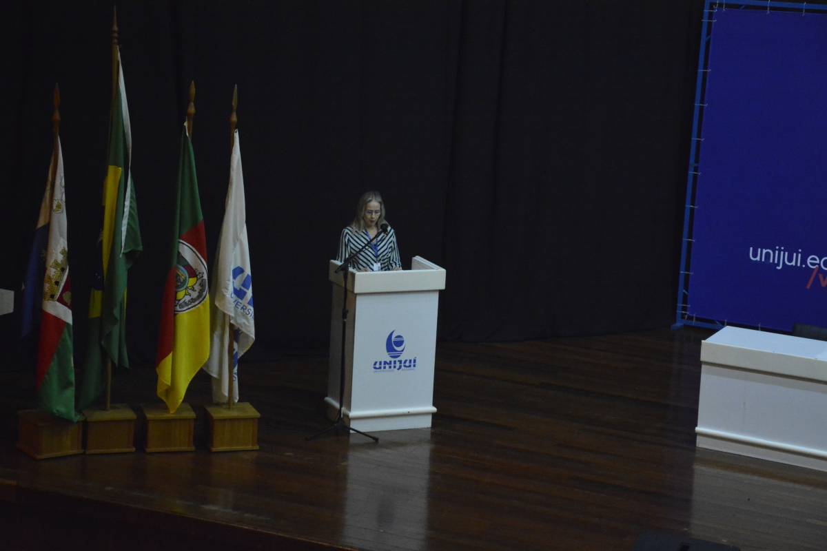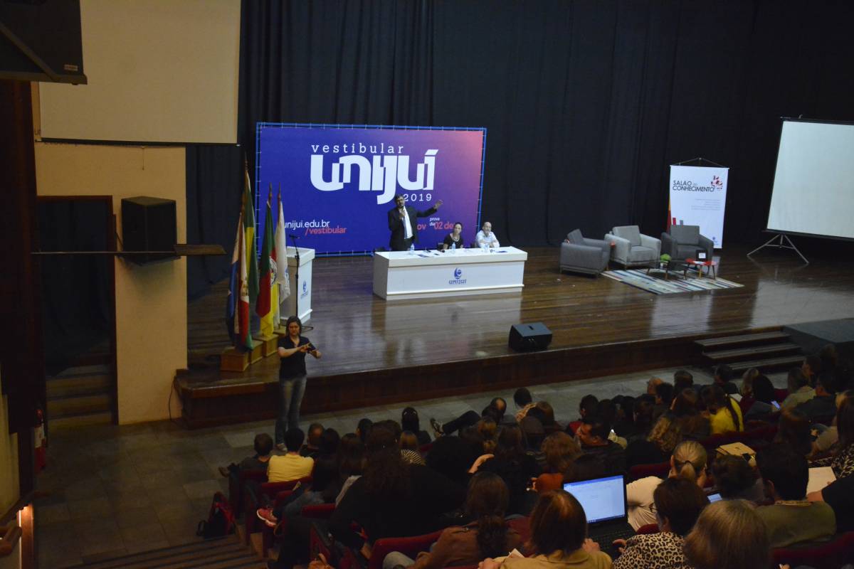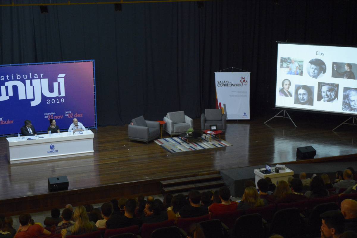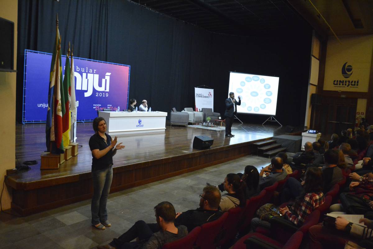 O Salão de Atos Argemiro Jacob Brum esteve lotado para esta atividade inicial. A professora Cátia Maria Nehring, Reitora da Unijuí, realizou a saudação de abertura do Salão do Conhecimento. Logo após, teve início o painel com a discussão do tema central.