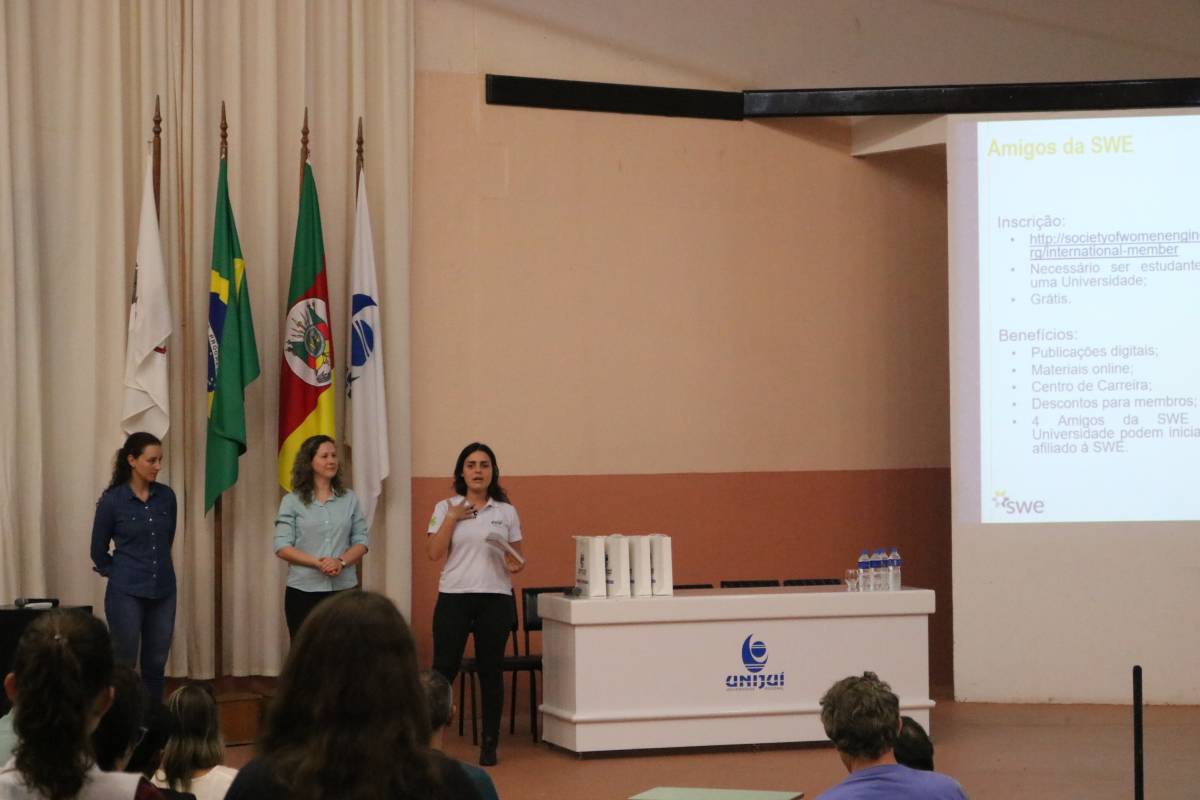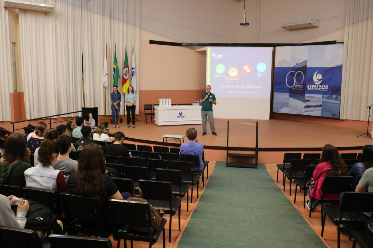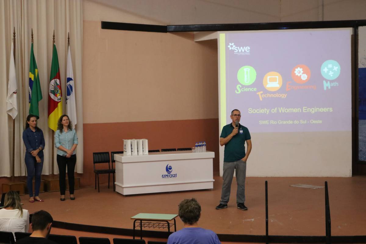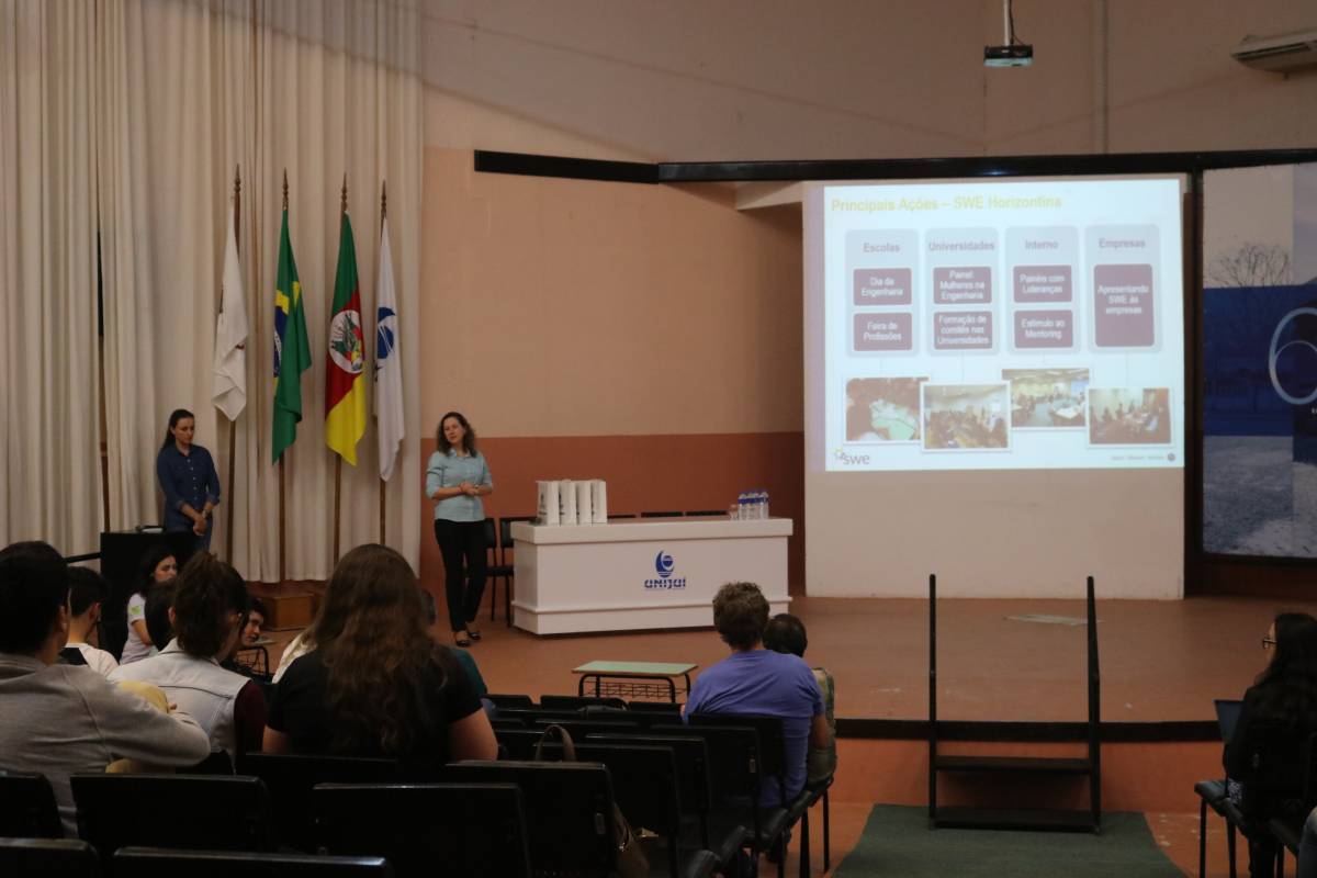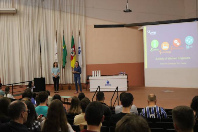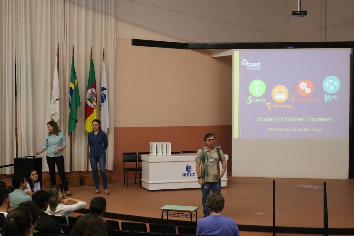 A programação contemplou três palestras. A primeira trouxe como temática “Sociedade das Mulheres Engenheiras” (SWE – Society of Women Engineers), ministrada pelas engenheiras Sandra Vasconcelos, Maitê Minetto, Fabiane Conrad e pela estudante Tatiane Preischart. Na oportunidade trouxeram o debate para o encorajamento das mulheres na escolha da engenharia e as áreas da tecnologia como carreira, através de diversas frentes. A segunda palestra a Empresa Químea Ambiental, por meio do Engenheiro Anderson Decker, apresentou soluções para melhoria de práticas ambientais em empreendimentos. E a terceira palestra ministrada pelo Engenheiro Roberto Haas, destacou a tecnologia do Grupo AERO, que adota a utilização de drones para obtenção de soluções adequadas às necessidades, nos segmentos do Agronegócio, Construção Civil e Mercado Digital.