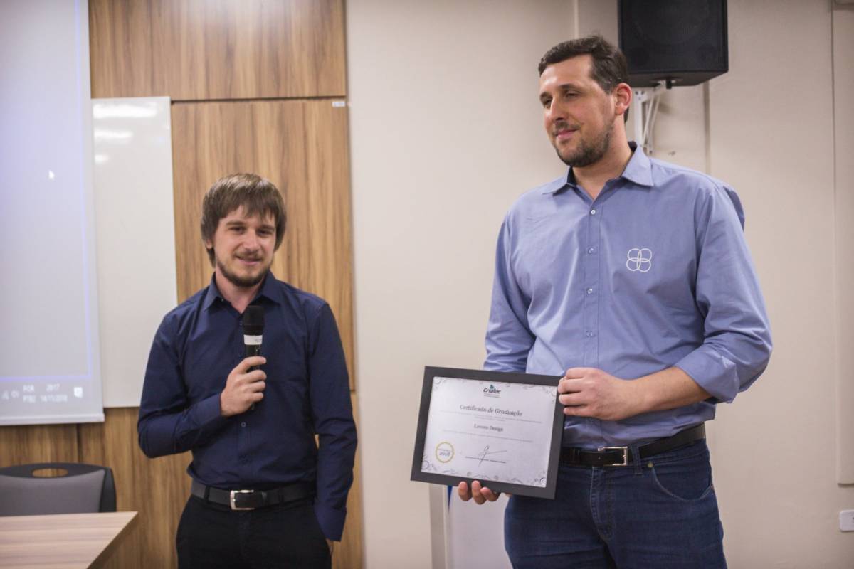 A última noite do evento ainda foi marcada pela graduação da empresa incubada pela Criatec Lavoro Design Integrado. Os sócios Marcel Meller e Alessandro Zangirolami dos Santos receberam o certificado de graduação e mostraram um pouco de sua trajetória enquanto empresa incubada e também falaram sobre os planos para o futuro.