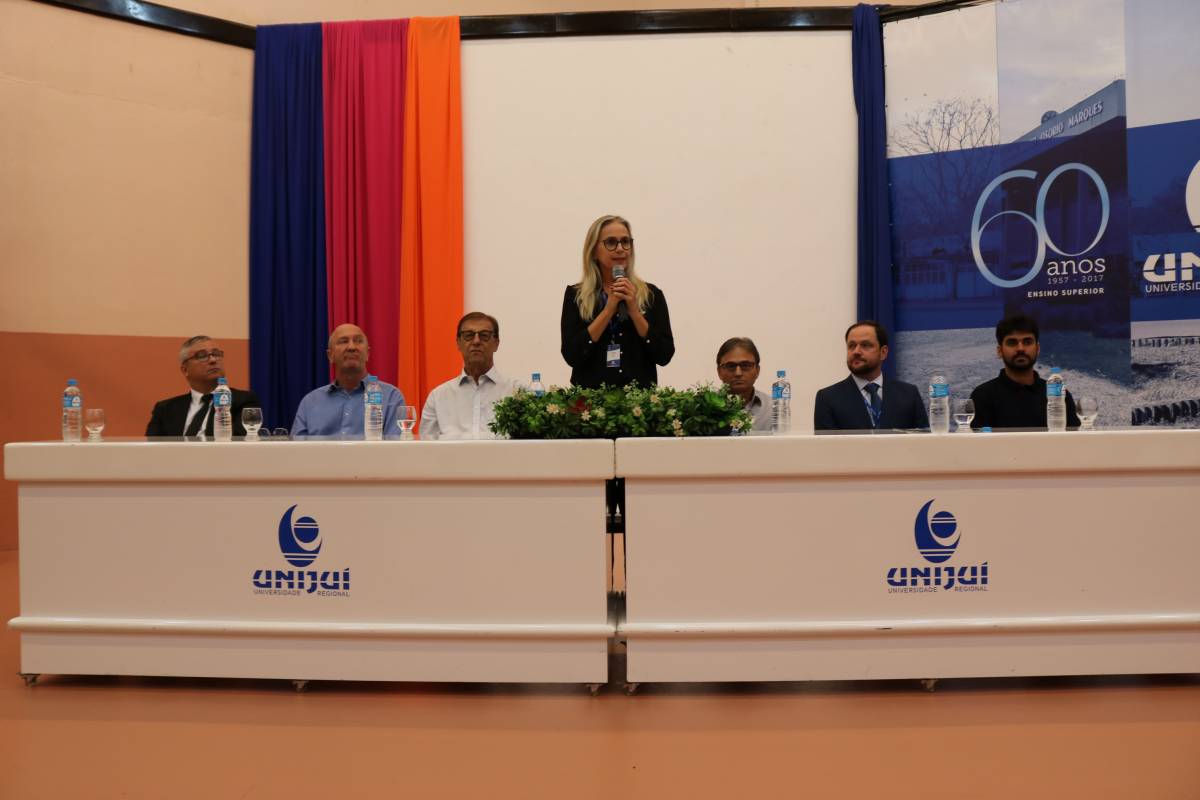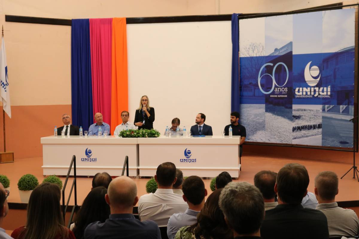 A Presidente da Fidene e Reitora da Unijuí, professora Cátia Maria Nehring, realizou abertura da cerimônia de posse, por meio da portaria que nomeava o novo Pró-Reitor do Campus Santa Rosa, professor Marcos Paulo Scherer.