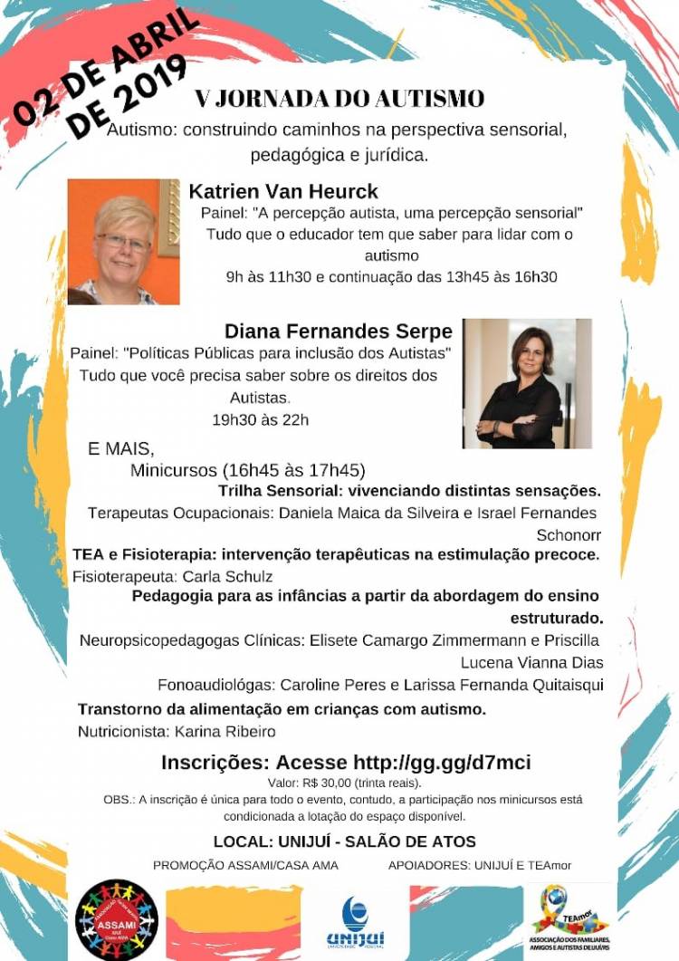 A V Jornada de Autismo é promovida pelo Grupo de Estudos e de Apoio ao Autismo - ASSAMI/CASA AMA, com o apoio da Associação dos Familiares, Amigos e Autistas de Ijuí - TEAmor - e Unijuí.