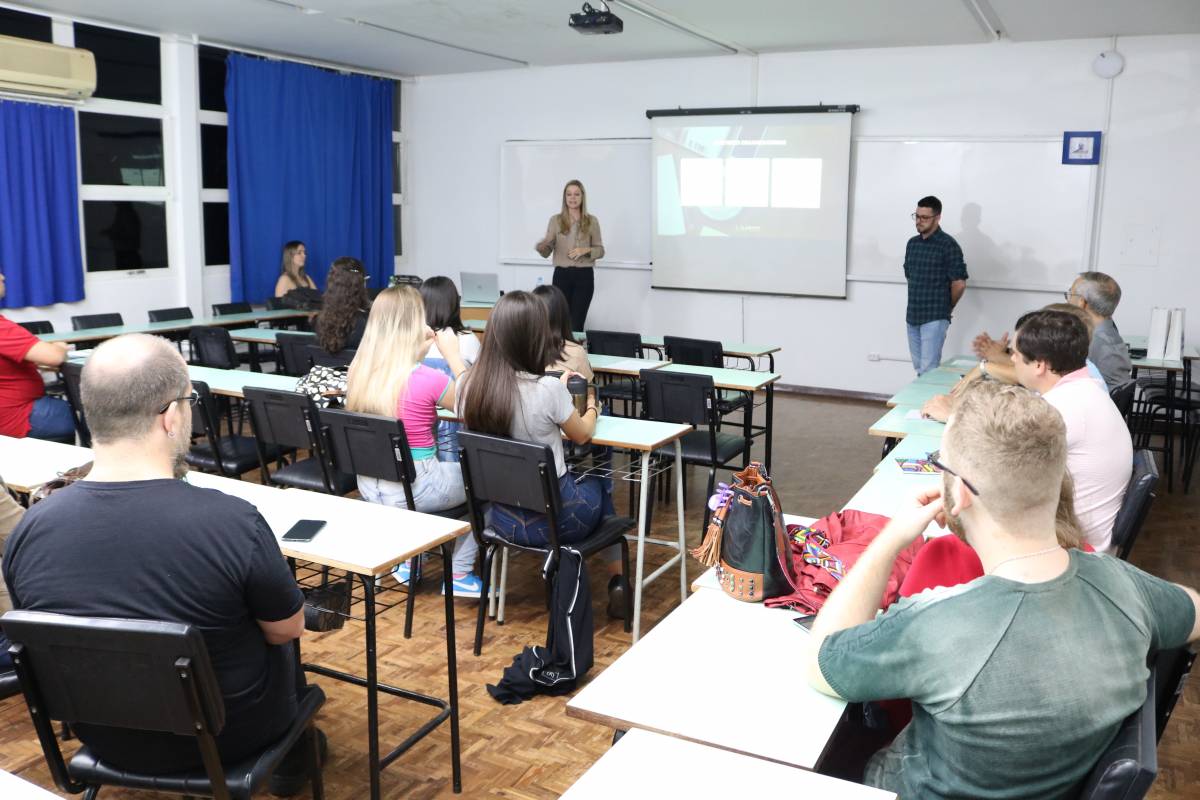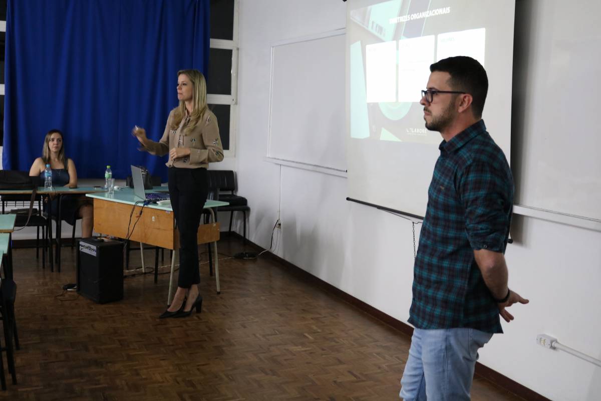 Na primeira aula, foi realizada uma conversa com os sócios da Colabore Comunicação Corporativa, Felipe Dorneles e Lisandra Steffen.