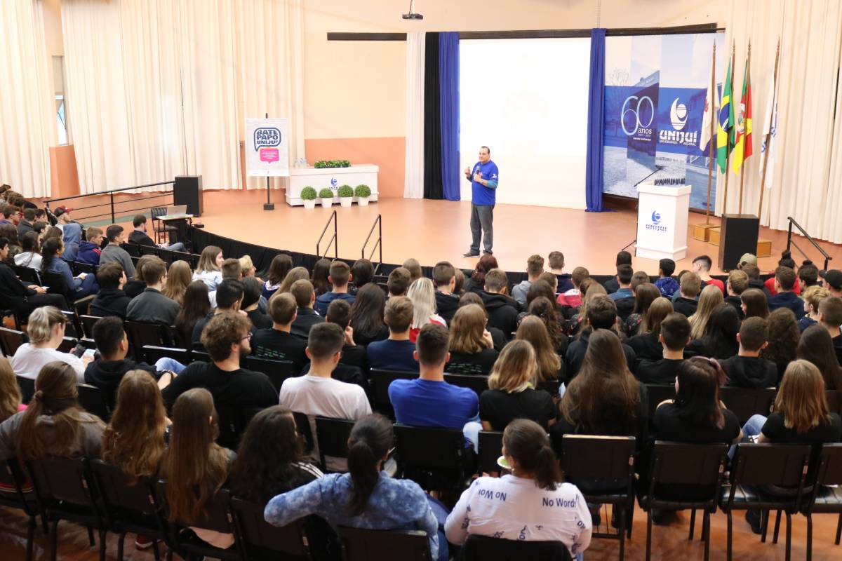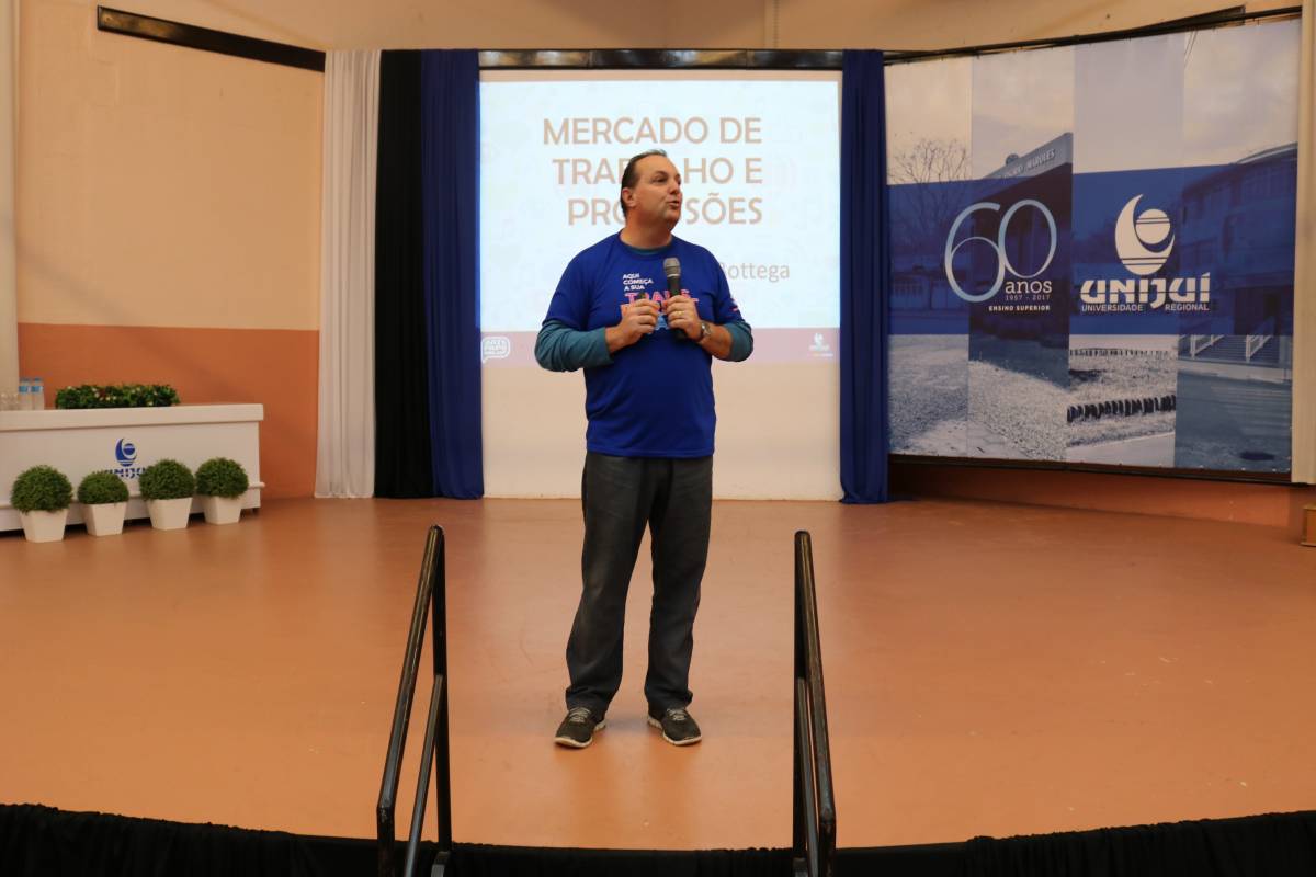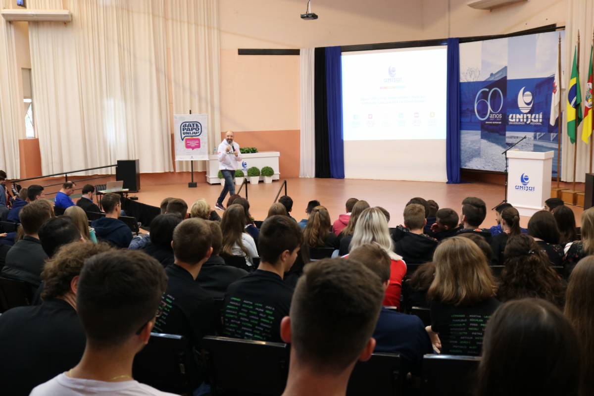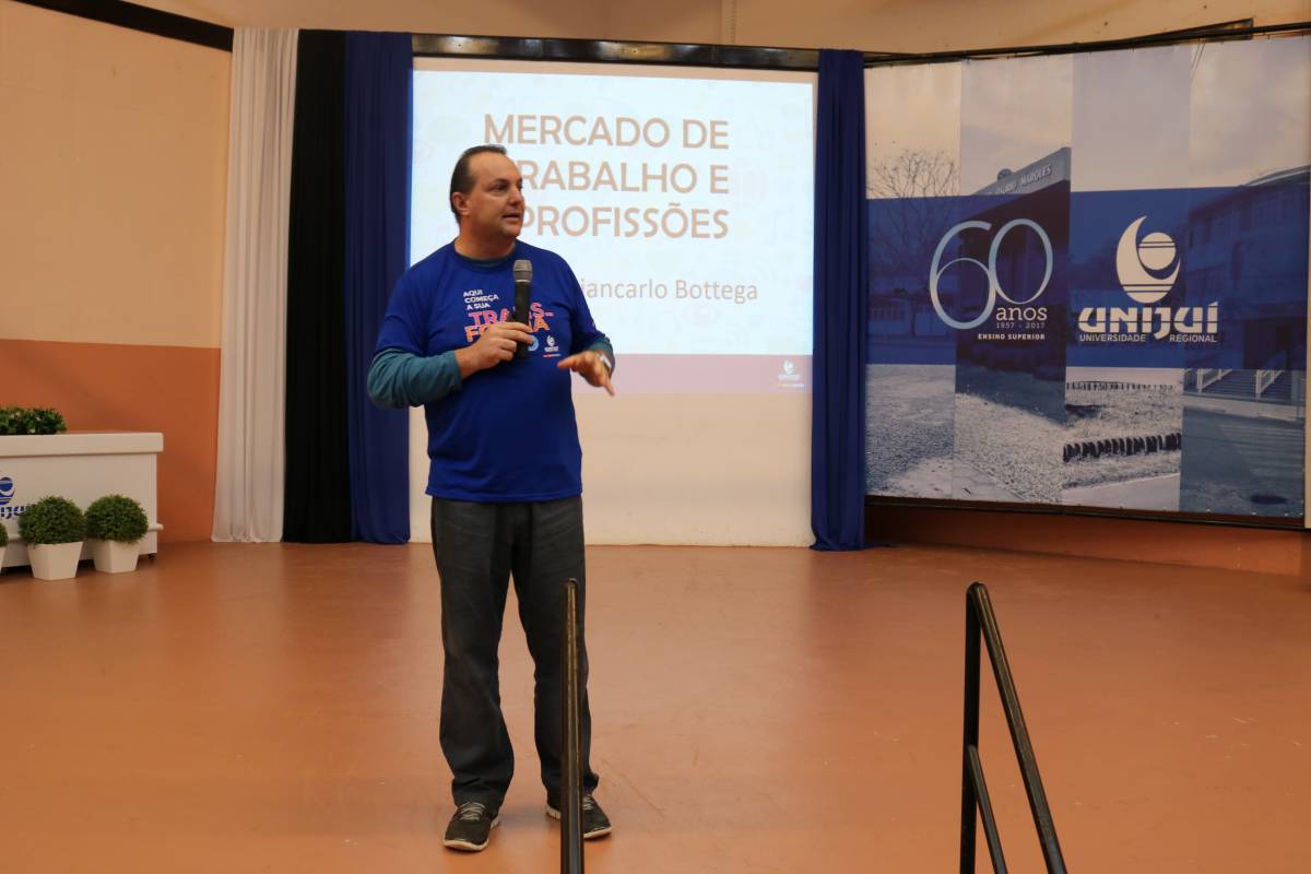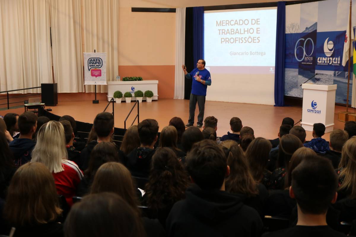 Uma conversa descontraída e instigante fez com que alunos do ensino médio lotassem o auditório central da Unijuí em Santa Rosa nesta terça-feira (21). Os participantes puderam agregar conhecimentos com as temáticas envolvendo “Escolha Profissional e Mercado de Trabalho”.