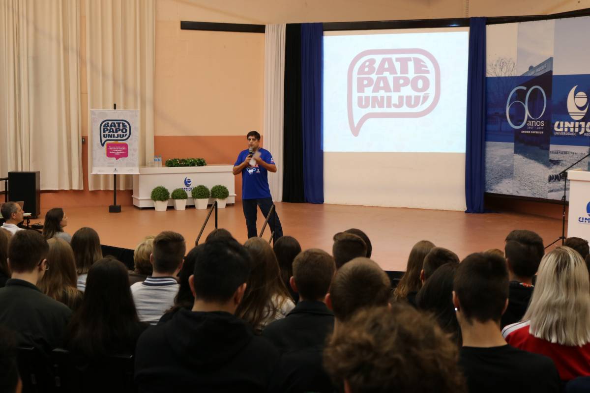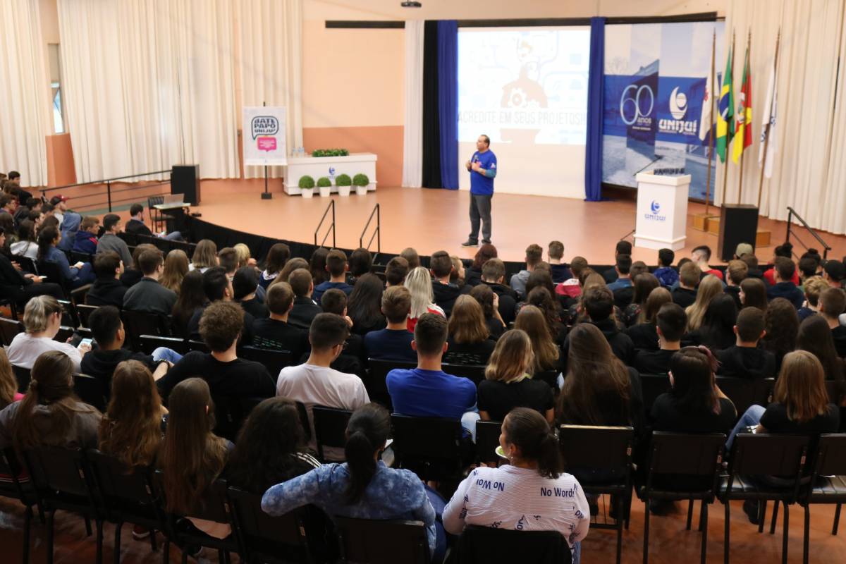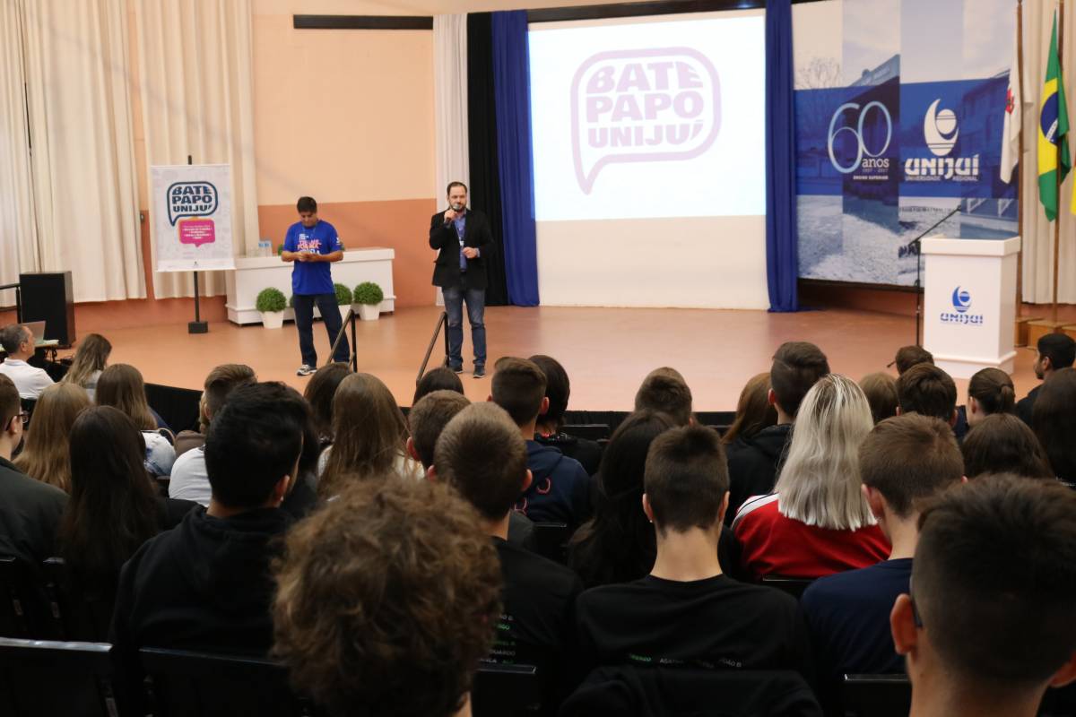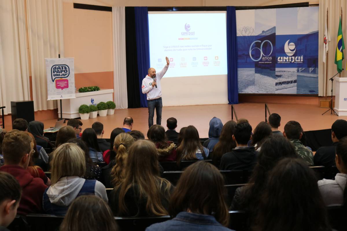 Uma conversa descontraída e instigante fez com que alunos do ensino médio lotassem o auditório central da Unijuí em Santa Rosa nesta terça-feira (21). Os participantes puderam agregar conhecimentos com as temáticas envolvendo “Escolha Profissional e Mercado de Trabalho”.