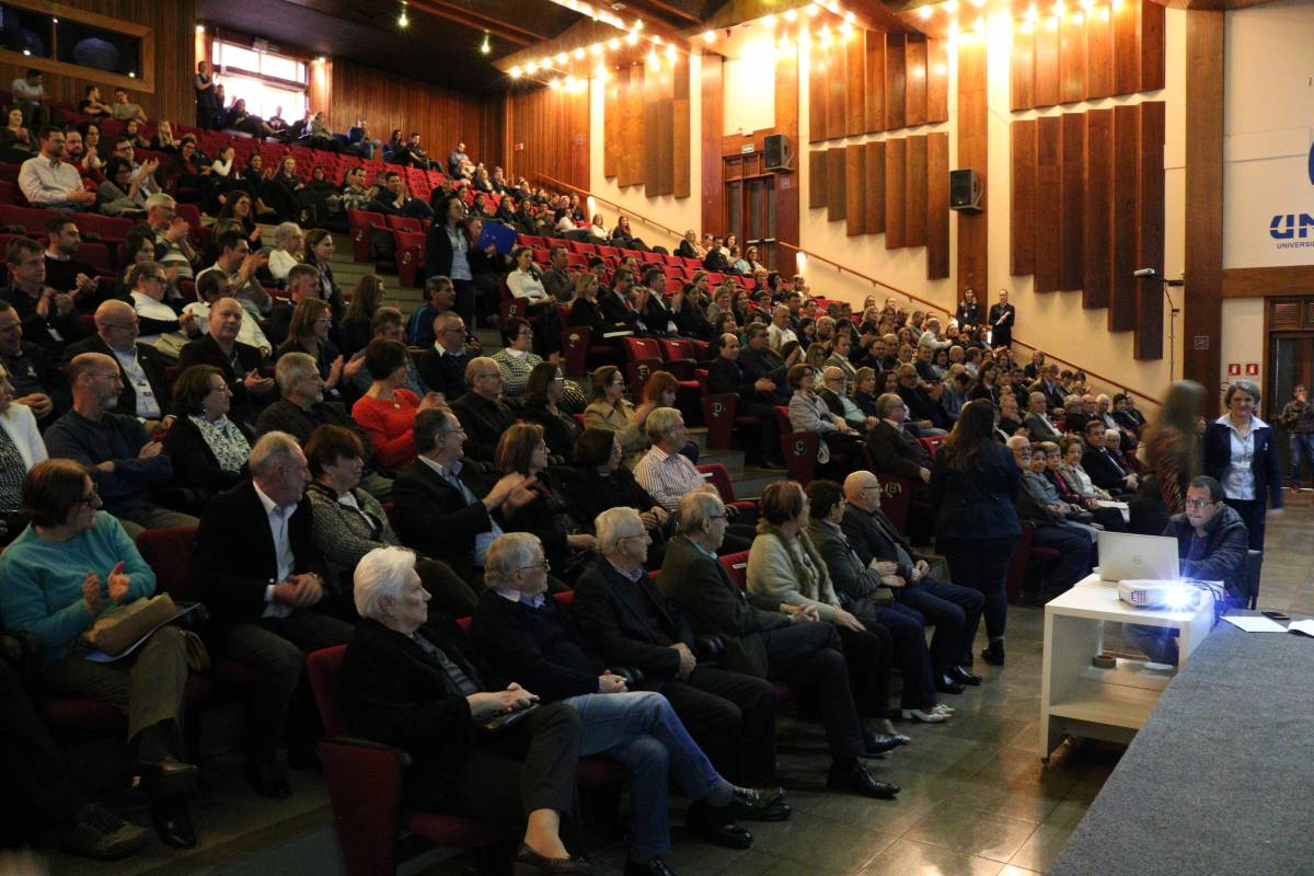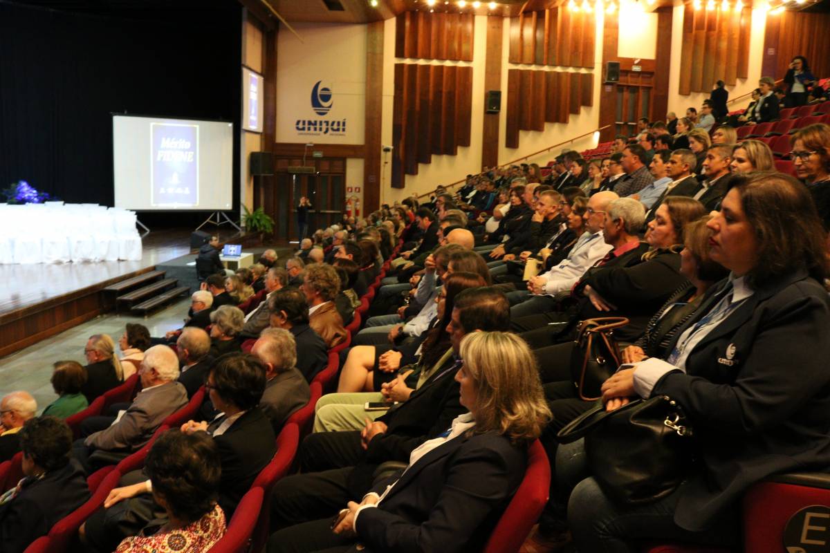 O evento denominado “Mérito Fidene” realizado na tarde desta quinta-feira, 11, no Salão de Atos Argemiro Jacob Brum, homenageou 218 pessoas que completam 15, 20 e 25 (ou mais) anos de casa neste ano. Na oportunidade foram homenageadas 21 pessoas na categoria Ródio, completando 15 anos, 22 pessoas na categoria Prata, que estão completando 20 anos e, por fim, 170 pessoas na categoria ouro, completando 25 anos ou mais de Fundação em 2019. Todos os homenageados receberam da professora Cátia Nehring, presidente da Fidene e reitora da Unijuí, um Pin comemorativo. Durante o evento também ocorreu a apresentação artística do professor e músico Oseias Machado e posteriormente foi servido um coquetel de confraternização.
