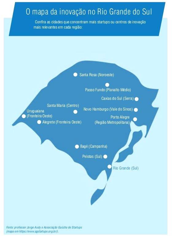 Segundo dados da ABS Startup Base, o Estado figura em segundo lugar em número de startups, com 897, ficando atrás apenas de São Paulo. Embora a concentração seja maior na região metropolitana de Porto Alegre, estendendo-se até o Vale dos Sinos (Novo Hamburgo e São Leopoldo), a cadeia de inovação gaúcha tem capilaridade no interior.