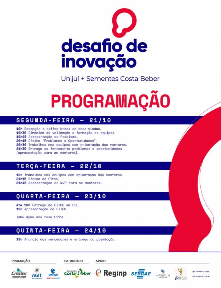 O Desafio, que está com inscrições abertas até o dia 18 de outubro, envolverá equipes na busca da solução para uma problemática apresentada pela empresa parceira. Essa problemática será apresentada no primeiro dia do evento, que acontece no dia 21 de outubro. A partir disso, ideia é fazer com que as equipes inscritas se movimentem na proposição de ideias criativas e funcionais, com possibilidade prática de aplicação na empresa Sementes Costa Beber.