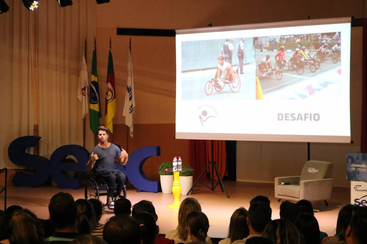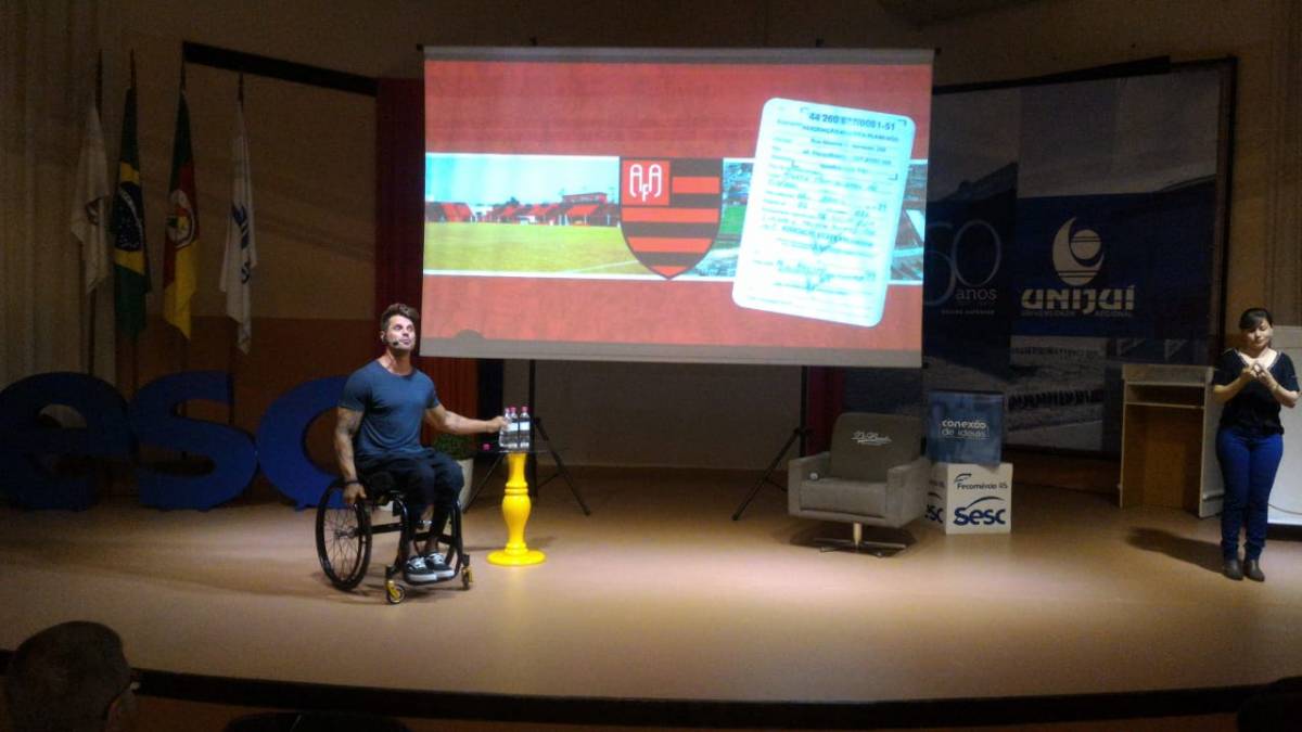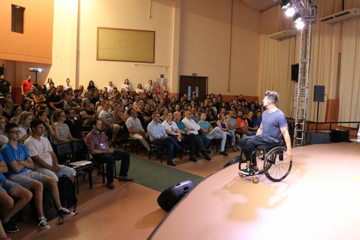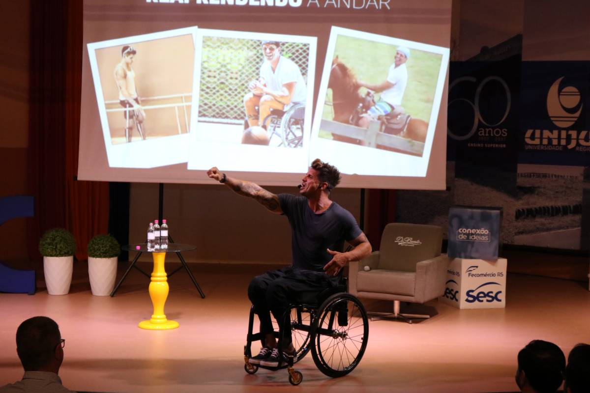 O auditório central da Unijuí esteve lotado para prestigiar a palestra do atleta paralímpico, Fernando Fernandes, durante a noite de quarta-feira, dia 20, no campus Santa Rosa, por meio do projeto Conexão de Ideias. Durante a sua fala, o atleta contou sua trajetória de vida, os desafios que enfrentou, a superação e como se reinventou após ter sofrido um acidente de carro, no ano de 2009, quando retornava de uma partida de futebol, interrompendo os seus planos de ser modelo internacional e o deixando em uma cadeira de rodas.