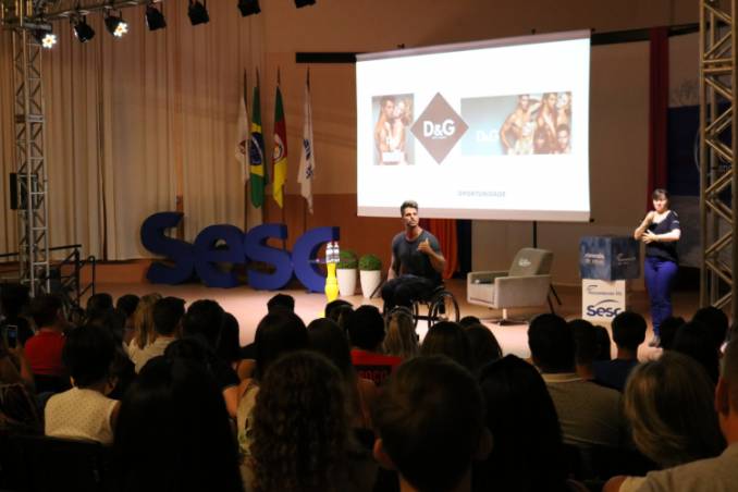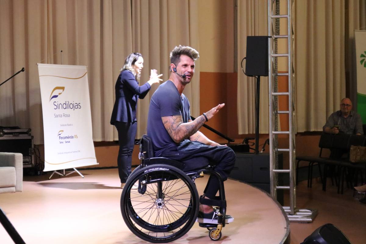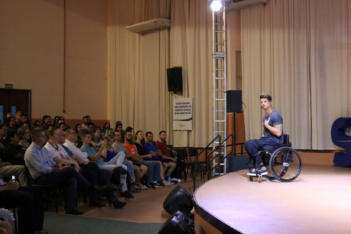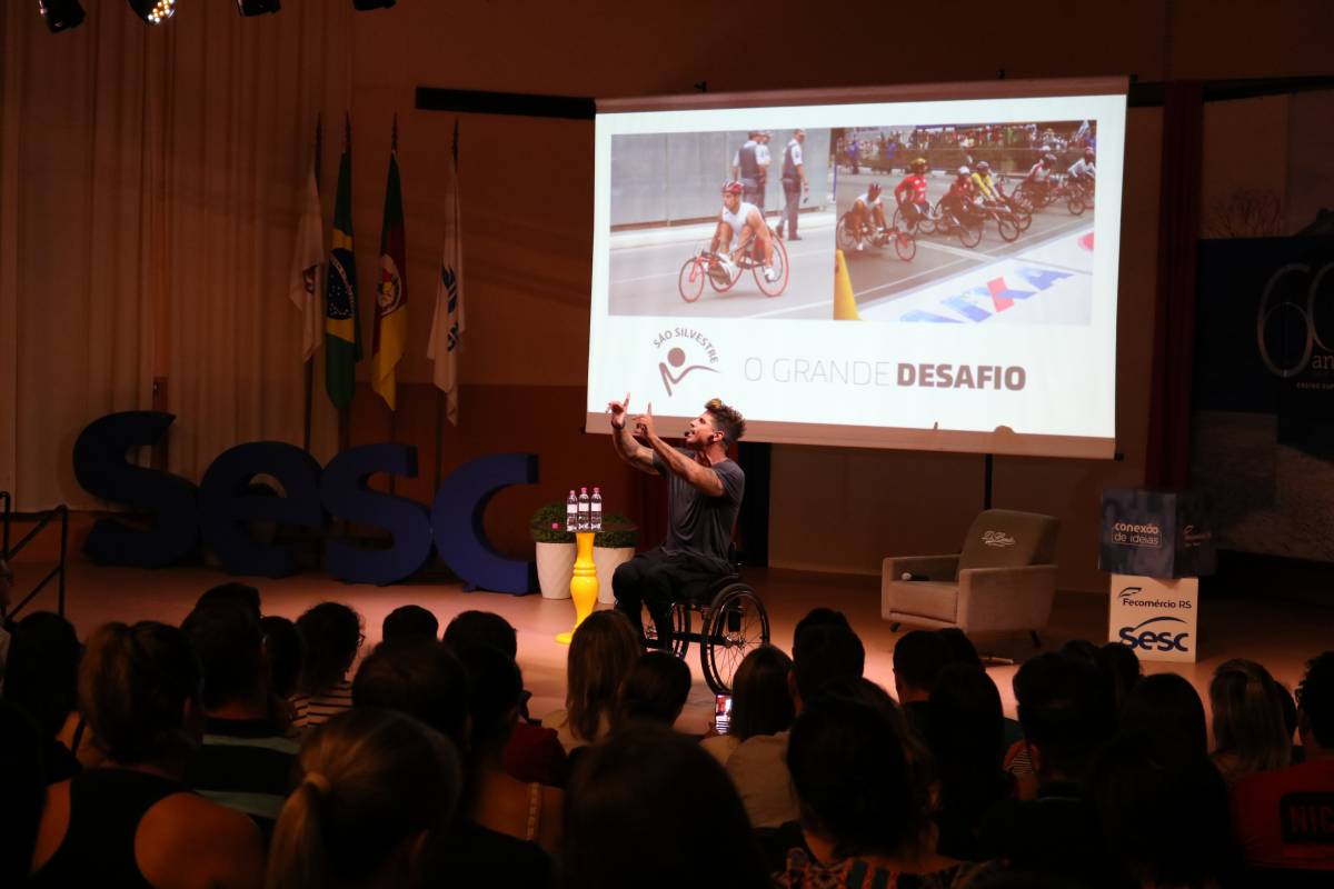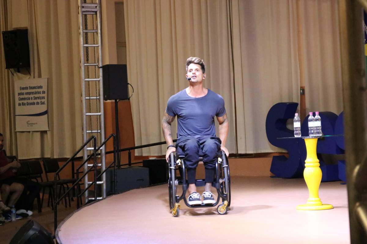 O auditório central da Unijuí esteve lotado para prestigiar a palestra do atleta paralímpico, Fernando Fernandes, durante a noite de quarta-feira, dia 20, no campus Santa Rosa, por meio do projeto Conexão de Ideias. Durante a sua fala, o atleta contou sua trajetória de vida, os desafios que enfrentou, a superação e como se reinventou após ter sofrido um acidente de carro, no ano de 2009, quando retornava de uma partida de futebol, interrompendo os seus planos de ser modelo internacional e o deixando em uma cadeira de rodas.