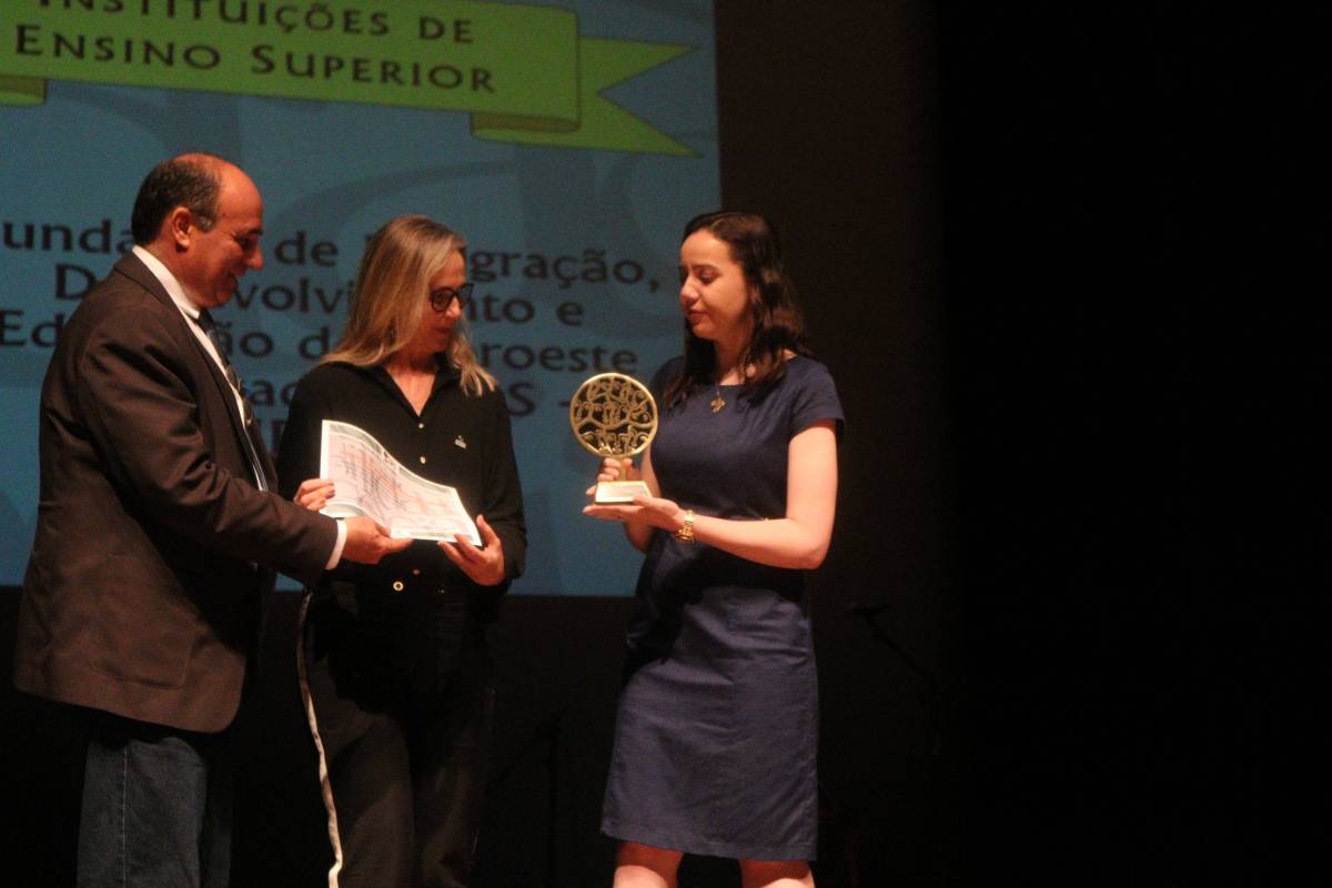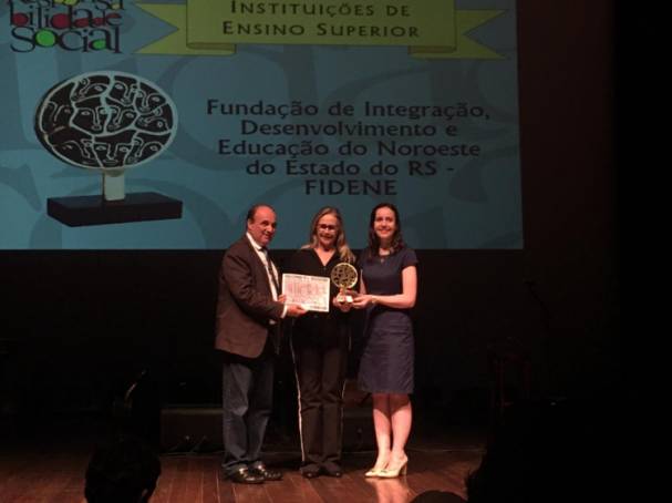 A presidente da Fidene e Reitora da Unijuí, professora Cátia Maria Nehring, subiu ao palco do Teatro Dante Barone, na Assembleia Legislativa, para receber o Prêmio de Responsabilidade Social concedido pelo Parlamento Gaúcho. Esta é a quinta vez que a Fidene/Unijuí é premiada com o troféu que reconhece projetos voltados ao bem-estar social e à preservação do meio ambiente. Além disso esta é a quarta vez consecutiva, fato inédito na história da premiação.