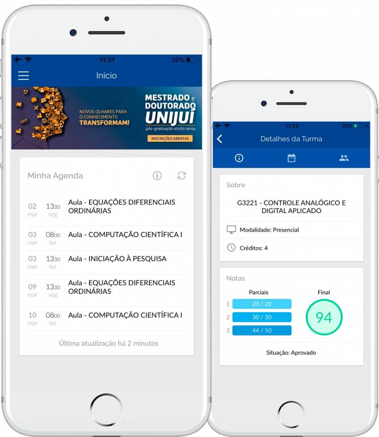 - Recebimento de notificações, como postagem de notas, trocas de sala de aula, vencimento de empréstimos da biblioteca e avisos da Universidade.