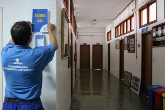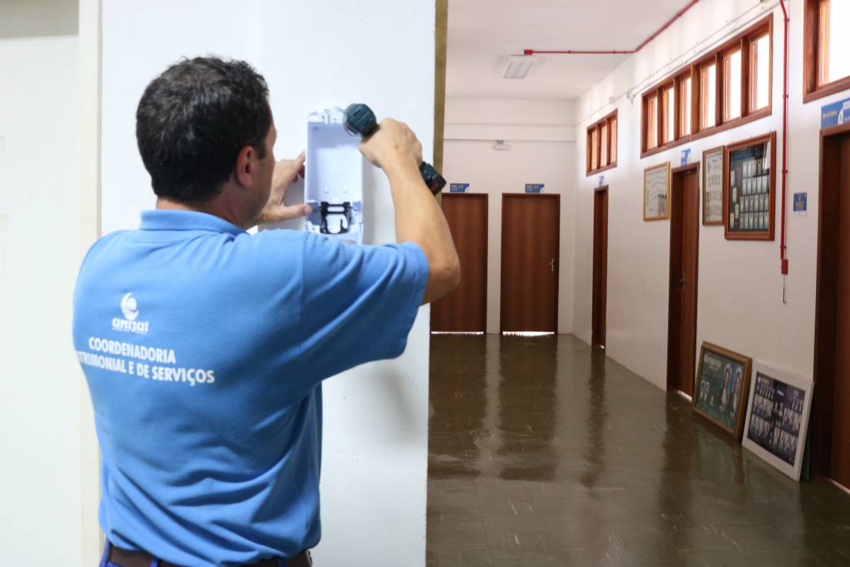 - Estimular a higienização das mãos com água e sabonete líquido e/ou preparações alcoólicas, provendo, conforme as possibilidades, lavatório/pia com dispensador de sabonete líquido, suporte com papel toalha, lixeira com tampa com acionamento por pedal e dispensadores com preparações alcoólicas para as mãos (álcool em gel), em pontos de maior circulação, tais como: recepção, corredores de acessos à sala de aulas e refeitório;