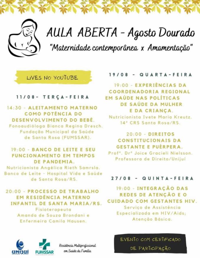 A Residência Multiprofissional em Saúde da Família, ofertada em Santa Rosa em uma parceria entre a Unijuí e a Fundação Municipal de Saúde de Santa Rosa (Fumssar), vai realizar, durante este mês de agosto, uma série de aulas abertas, em lives no Youtube, para discutir questões importantes do aleitamento materno. Marcando o "Agosto Dourado", a programação vai ser desenvolvida em três dias, com a participação de profissionais de diversas áreas de atuação. As falas serão transmitidas no Youtube da Unijuí.