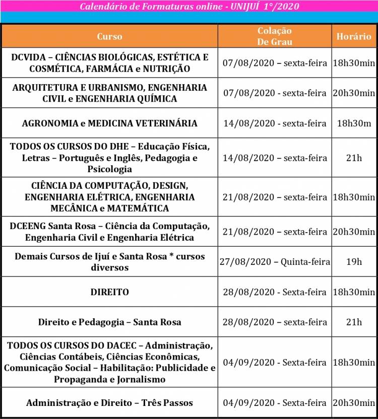 Ainda no mês de julho, o Setor de Formandos da Secretaria Acadêmica realizou reunião com as comissões de formatura para esclarecimentos e alinhamento do procedimento das solenidades. Mesmo online, as famílias puderam acompanhar esse momento tão especial e esperado, sendo que a solenidade seguiu todos os protocolos tradicionais, como o juramento e os discursos típicos destas solenidades, só que agora adaptados ao formato online. Este novo formato de colação de grau não impossibilita que o estudante realize posteriormente a formatura presencial, quando não houver mais restrição, em datas que serão definidas ao longo do segundo semestre.