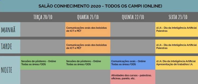 A Comissão Organizadora também divulgou o cronograma geral do evento, que compreende duas noites para apresentações de trabalhos na forma de pôster, uma noite para comunicações orais e o Dia da Inteligência Artificial - d.I.A. , reservado para palestras e apresentações de trabalhos sobre o tema Inteligência Artificial, em diferentes campos do conhecimento. A proposta está alinhada com a temática da 17ª Semana Nacional de Ciência e Tecnologia (SNCT) 2020, coordenada pelo Ministério da Ciência, Tecnologia e Inovações. O evento Dia da Inteligência Artificial (d.I.A.) é uma categoria específica do Salão do Conhecimento 2020, exclusiva para submissão de trabalhos sobre o tema Inteligência Artificial, em qualquer campo do conhecimento, produzidos por estudantes, professores e/ou técnicos da Unijuí.
