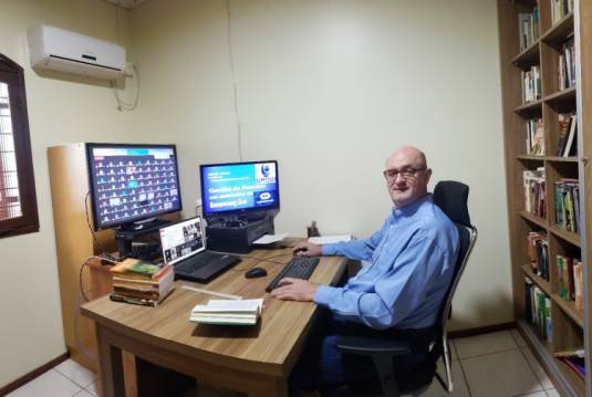 Para o professor do Departamento de Ciências Administrativas, Contábeis, Econômicas e da Comunicação (DACEC), Pedro Buttembender, atuando de Santa Rosa, o home office já estava presente no seu planejamento e veio confirmar uma tendência. “Este, combinado com as atividades online síncronas e assíncronas, estabelecem, nos negócios e na educação, uma dinâmica inovadora nos processos de aprendizagem, tanto em termos de amplitude como de velocidade, permitindo desenvolver novas competências, reforçando as atuais, de forma muito mais rápida e responsivas. As metodologias educacionais e de trabalho também são transformadas, onde a maior liberdade, flexibilidade e autonomia está associada a organização, fluxos, disciplina individual e coletiva. As vantagens estão nos fluxos, na pontualidade, otimização e racionalização dos tempos, em especial nas atividades coletivas”, salienta.