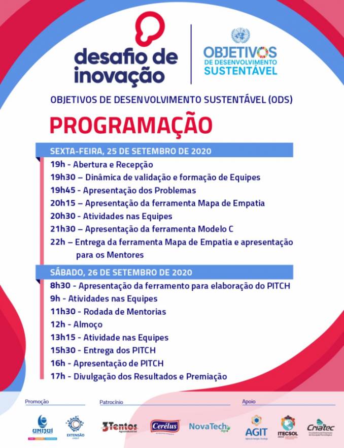 Realizado pela Vice-Reitoria de Pós-Graduação, Pesquisa e Extensão, o o Desafio de Inovação Social tem o patrocínio da 3Tentos Agroindustrial, Cérelus e Novatech Agro. Também tem o apoio da Agência de Inovação e Tecnologia, Incubadora de Economia Solidária, Desenvolvimento e Tecnologia Social - Itecsol e da Incubadora de Empresas de Inovação Tecnológica - Criatec.
