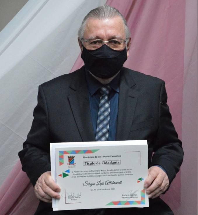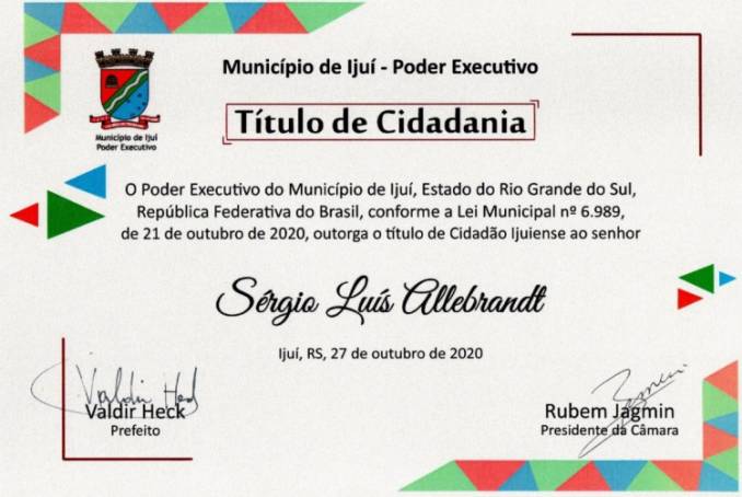 O professor da Unijuí, Dr. Sérgio Allebrandt, recebeu, nesta terça-feira, dia 27, o título de Cidadão Ijuiense da Câmara de Vereadores em Sessão Solene. A indicação do nome foi realizada pelo Poder Executivo.