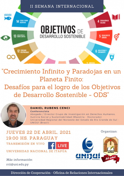 O professor do Programa de Pós-Graduação Stricto Sensu em Direitos Humanos da Unijuí, Daniel Rubens Cenci, participa nesta quinta-feira, dia 22 de abril, como palestrante na II Semana Internacional Objetivos de Desenvolvimento Sustentável da Universidade Nacional de Itapuá, do Paraguai.