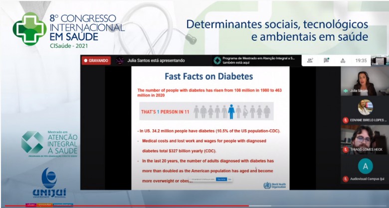 Doutora em Atividade Física e Saúde e pós-doutora em Retinopatia Diabética, Julia Matzembacher dos Santos foi convidada para palestrar sobre “O impacto do estrogênio ambiental e do exercício físico na captação de glicose, resistência à insulina e no desenvolvimento de diabetes tipo 2”. Ela antecedeu a fala da doutora em Enfermagem, Edvane Birelo Lopes de Domenico, que abordou o “Cuidado integral, interdisciplinar e baseado em evidências científicas: desafios contemporâneos”.