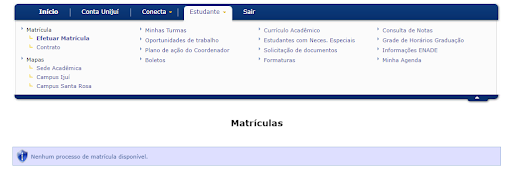 ou na aba Estudante (abaixo), selecionando Matrícula e Efetuar Matrícula.