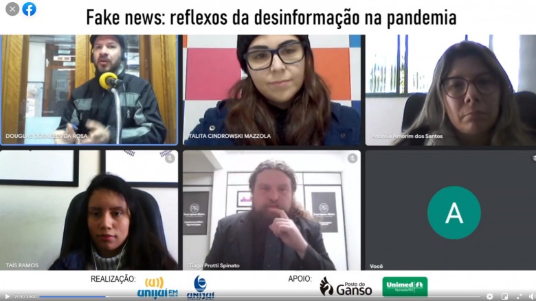 Para debater os reflexos da desinformação na pandemia, o Rizoma Temático da Unijuí FM recebeu nesta quinta-feira, dia 1º de julho, Tiago Protti Spinato, mestre em Direito, membro da Comissão de Novas Tecnologias da OAB e mentor do Projeto Integrador sobre Fake News; a acadêmica de Direito Taís Ramos, que participa do grupo; Talita Mazzola, jornalista e coordenadora da Assessoria de Marketing da Unijuí; e Andreia Amorim, enfermeira sanitarista e ex-secretária municipal de Saúde.