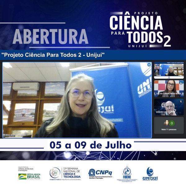 Na manhã desta segunda-feira, dia 5 de julho, a Fidene/Unijuí abriu oficialmente o Ciência para Todos Unijuí 2 – evento realizado de forma totalmente virtual, que busca promover ações de divulgação, educação e popularização da ciência para comunidade, em especial para professores e estudantes da Educação Básica. O evento, que acontece em parceria com o Conselho Nacional de Desenvolvimento Científico e Tecnológico (CNPq) e Ministério da Ciência, Tecnologia e Inovações, contará com uma série de atividades até a sexta-feira, dia 9, todas transmitidas pelo canal da Unijuí no Youtube.