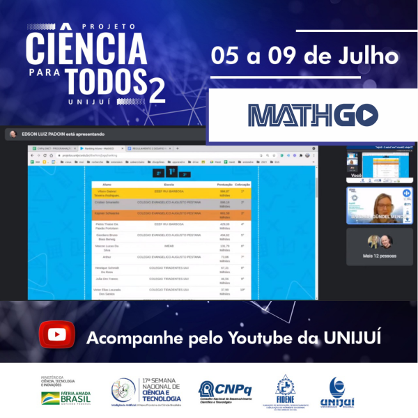 Outro momento em que a matemática teve destaque foi na divulgação dos vencedores do 2º Desafio MathGo, por meio do Projeto de Extensão AppGo: Desenvolvimento e Implementação de Softwares Educacionais. Durante a semana, os alunos puderam acessar o aplicativo MathGo, dedicado ao ensino da matemática, e responder às questões propostas. Os alunos que mais pontuaram foram Vilson Gabriel Teixeira Rodrigues, da Escola Estadual de Ensino Fundamental Rui Barbosa (1º lugar); Cristian Smaniotto, do Colégio Evangélico Augusto Pestana - Ceap (2º lugar) e Kaynan Schwanke, também do Ceap (3º lugar). Eles receberam troféus e medalhas.