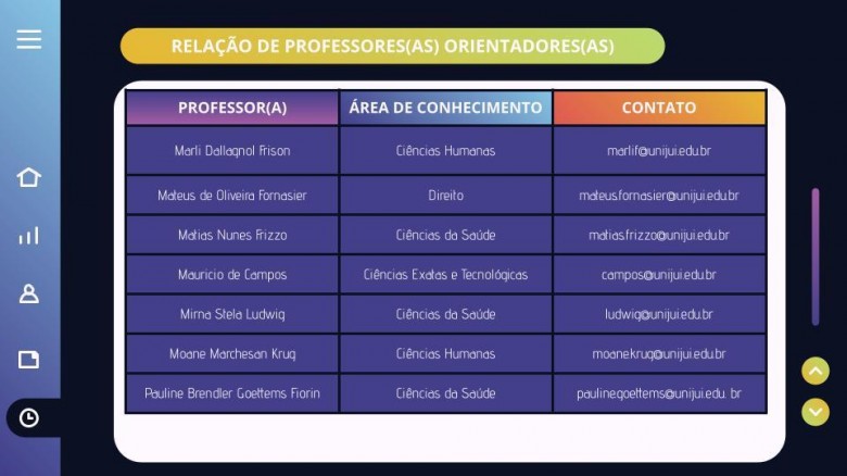 Os acadêmicos que desejam atuar como bolsista ou voluntário de pesquisa, podem entrar em contato com os professores orientadores indicados no quadro, manifestando seu interesse.