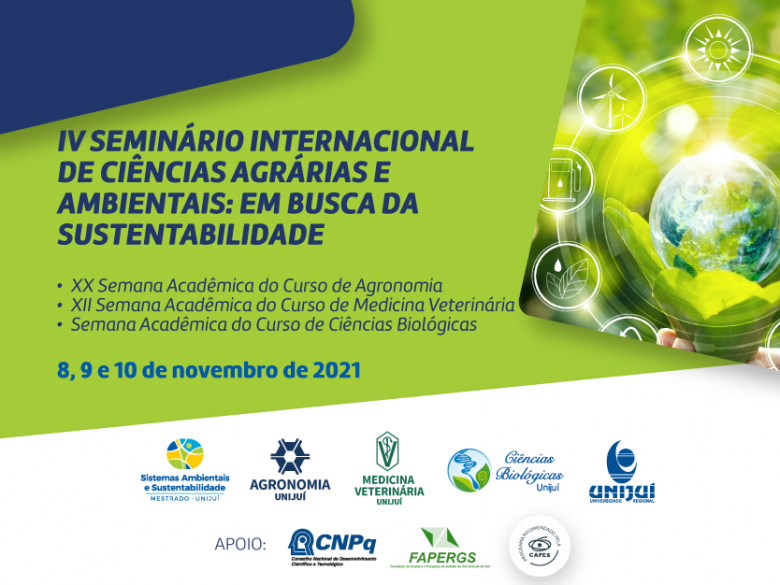 O evento acontecerá entre os dias 8 e 10 de novembro, de forma online, a partir de uma promoção da Unijuí - por meio do Programa de Pós-Graduação Stricto Sensu em Sistemas Ambientais e Sustentabilidade, cursos e centros acadêmicos de Agronomia, Ciências Biológicas e Medicina Veterinária; com apoio da Coordenação de Aperfeiçoamento de Pessoal de Nível Superior (Capes), Conselho Nacional de Desenvolvimento Científico e Tecnológico (CNPq) e Fundação de Amparo à Pesquisa do Estado do Rio Grande do Sul (Fapergs).
